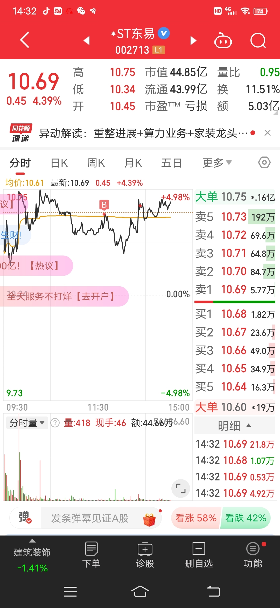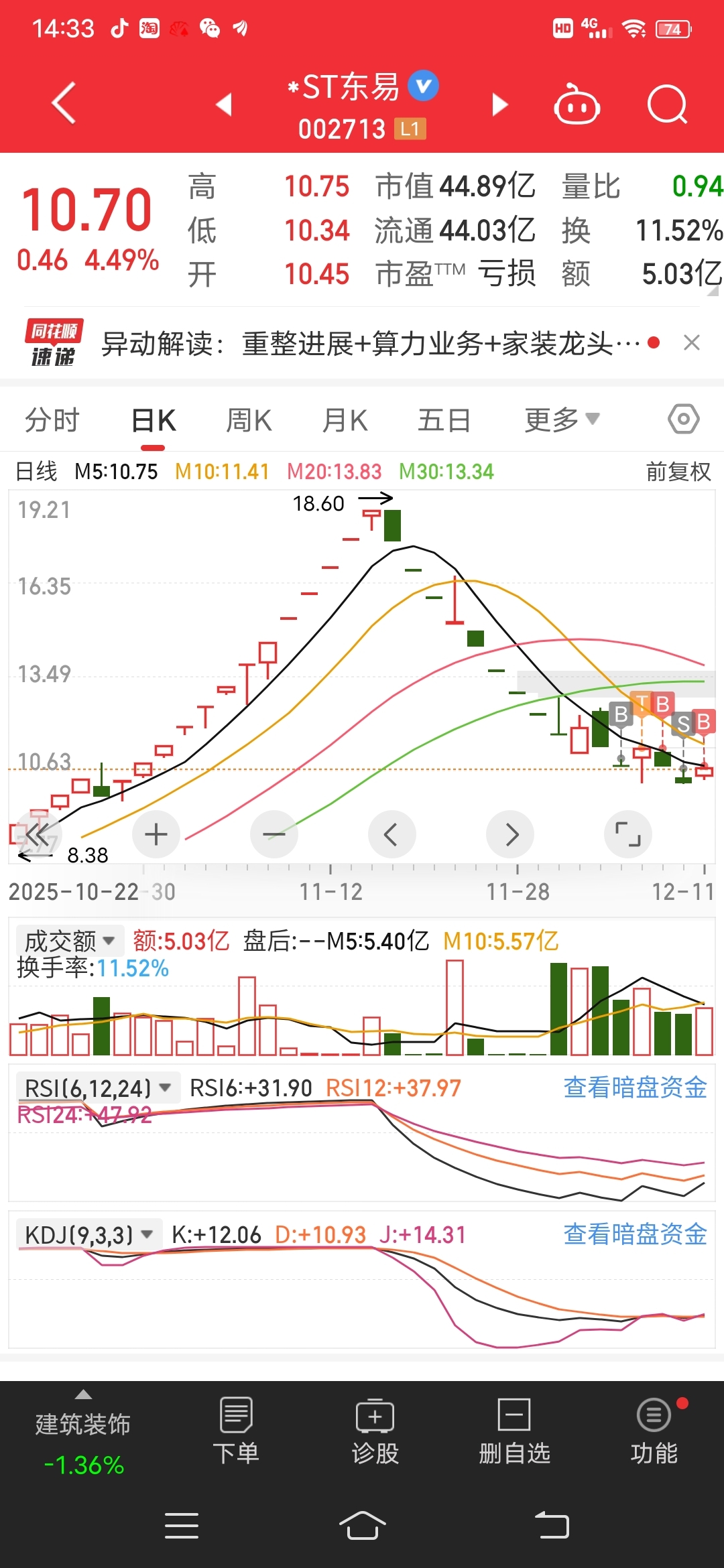 昨天把东易卖了,去买的迈为股份,今天用迈为股份挣的钱又买回了东易,就是东易退市了