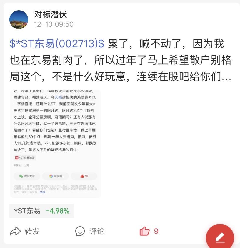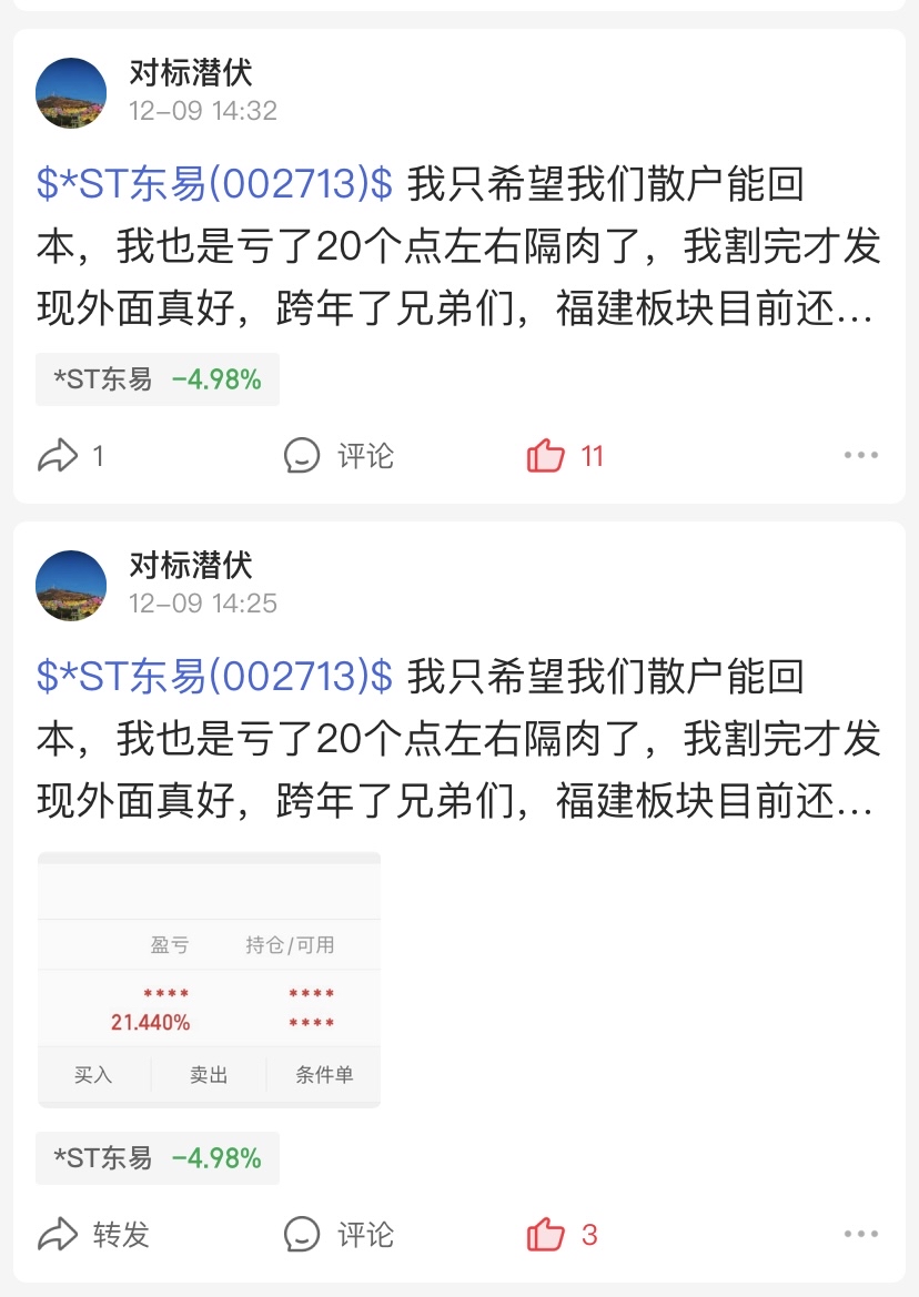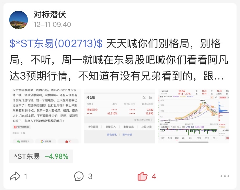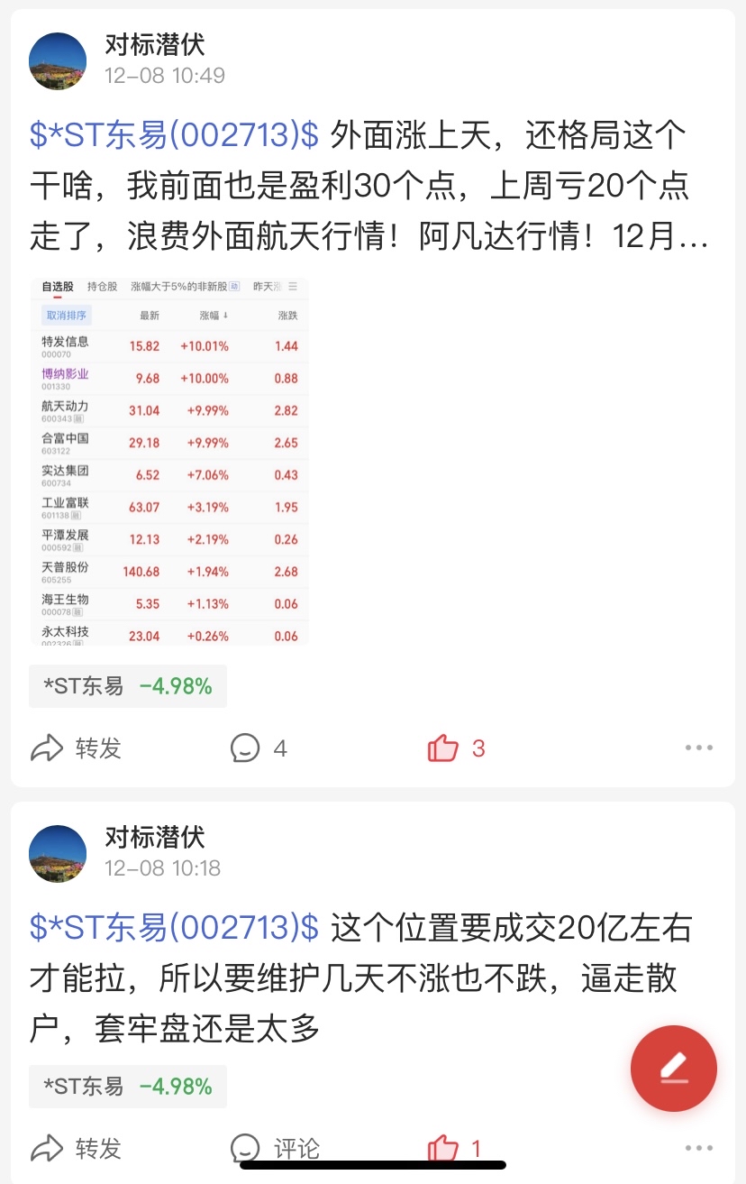 $*ST东易(SZ002713)$ 哎,早上发了个哈哈哈哈哈哈,其实不想哈哈哈哈哈你们,当初我也格局了看第一张照片,格局小一个月,最后呢亏钱走人,10月7号我突然明白了外面是航天+阿凡达3电影行情预期,所以马上割肉转阿凡达3(航天太高没敢去),每一天都在喊你们别格局了,去考虑考虑进阿凡达3的电影预期,不知道有多少人听进去,看最后面一张收益吧(阿凡达3带来的)