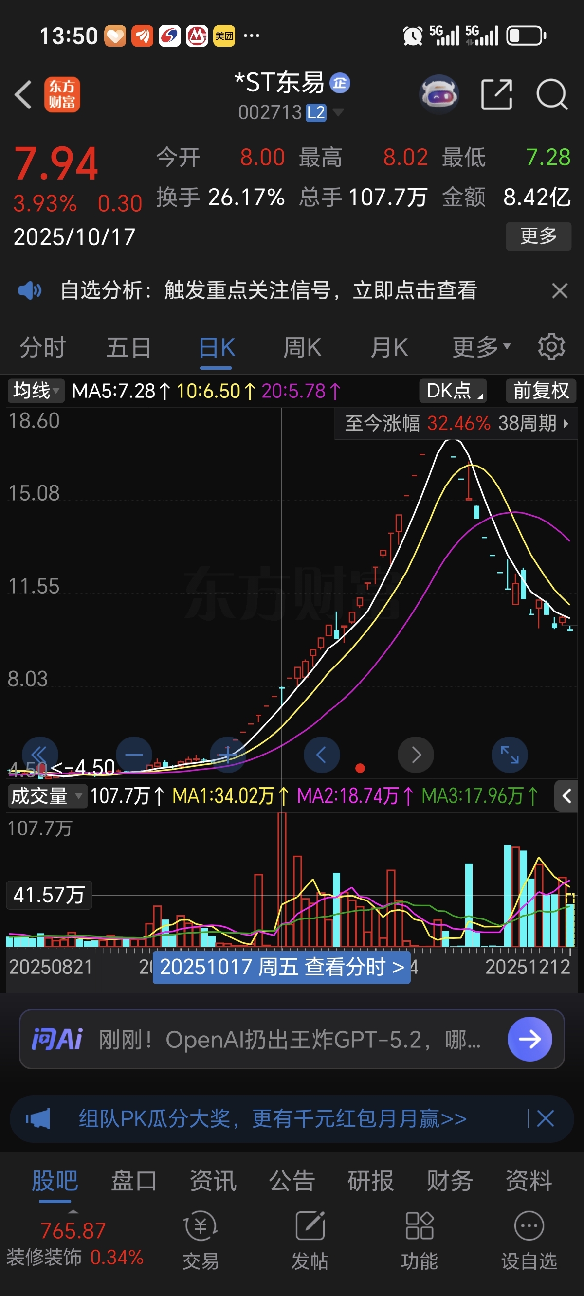 $*ST东易(SZ002713)$ 7.5块钱企稳,现在26亿市值的中迪半导体芯AI人工智能机器人都不涨,更何况一个建设中的东易了