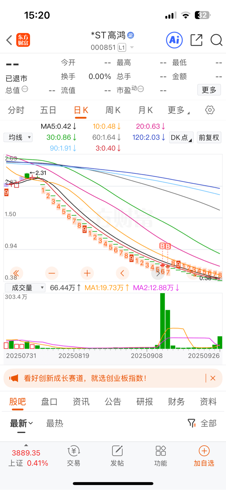 $*ST东易(SZ002713)$ 不要看到大v有b点图就以为买了很多,疯疯癫癫的跟着别人买,高鸿退市了我也不慌,为什么,因为我一个b点就一手