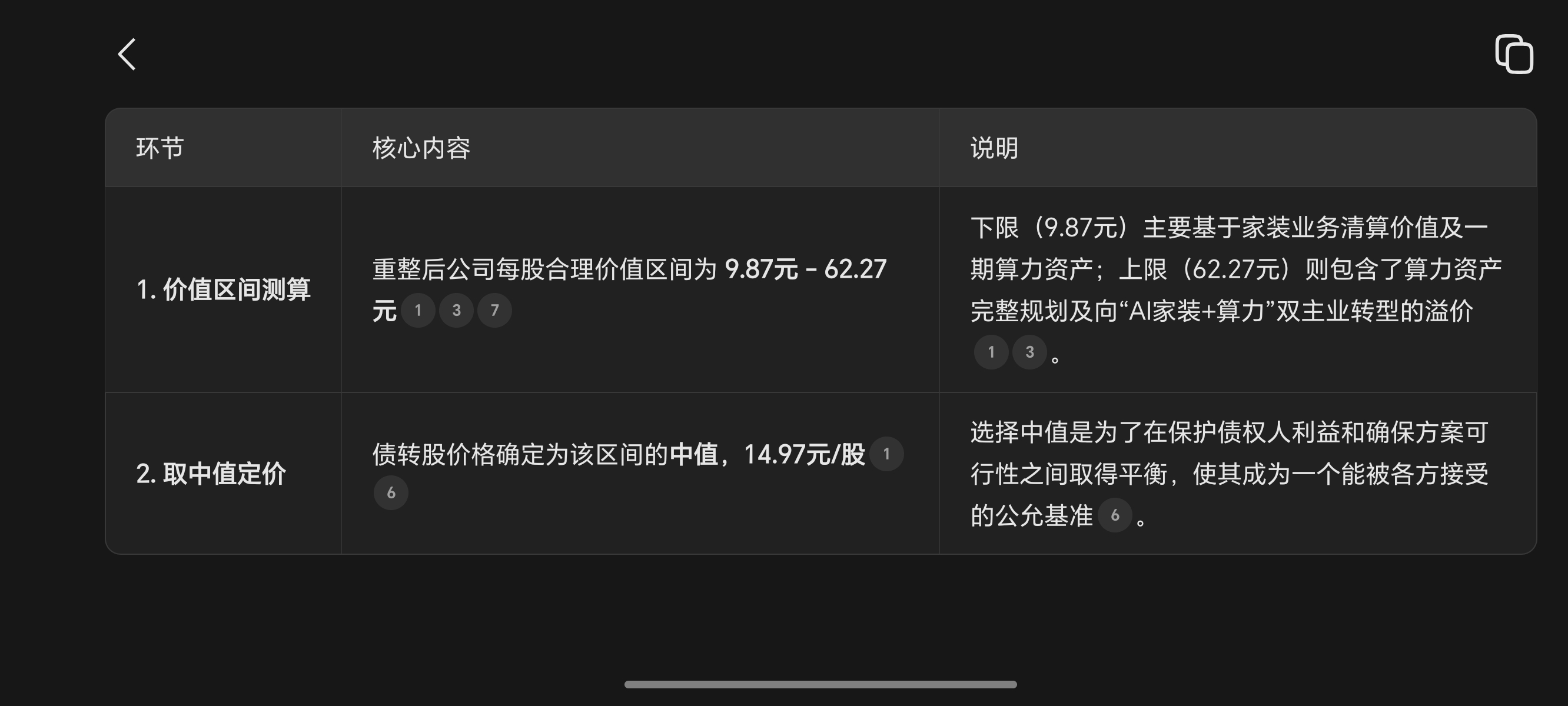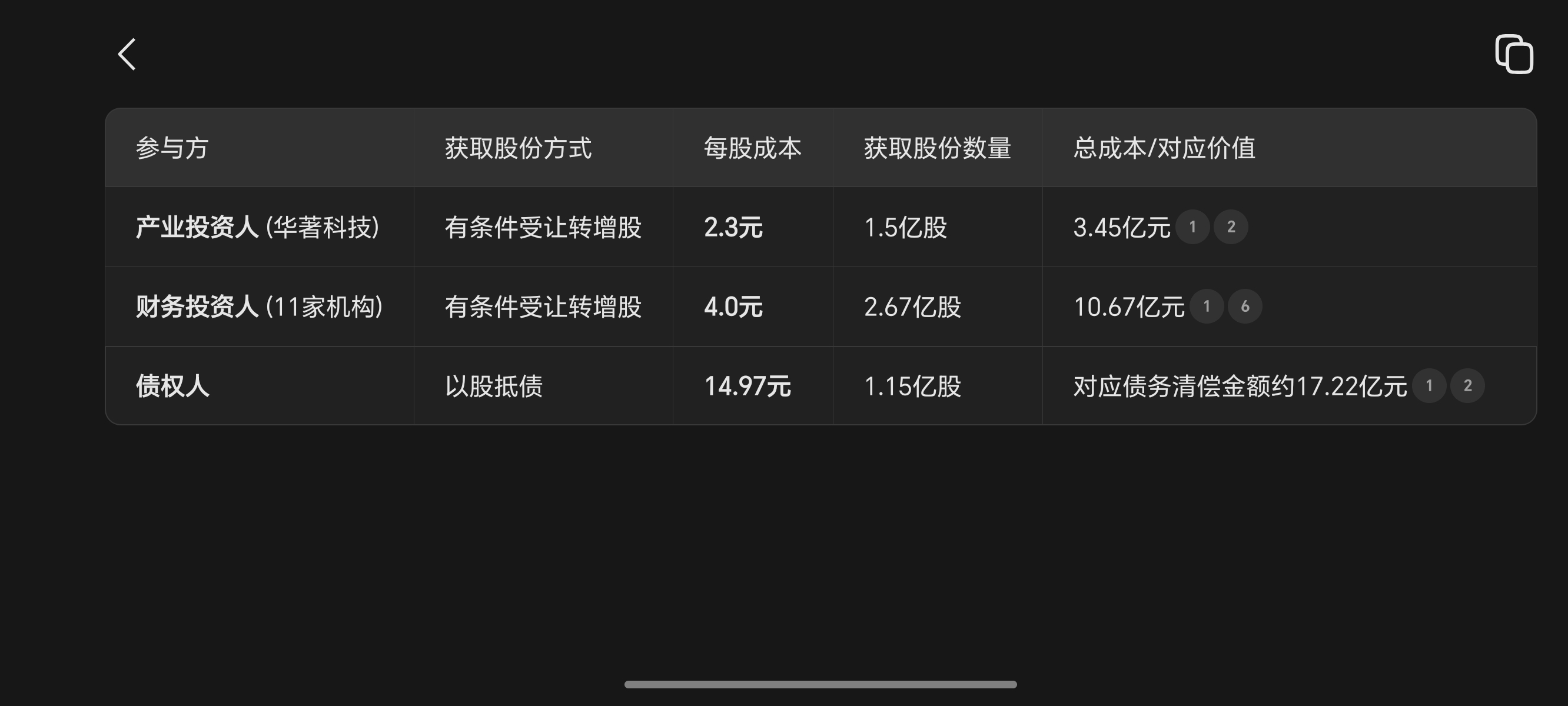财务投资人投资十亿限售一年,产业投资人限售三年,重整成功后公司合理价9.87至62.27。债权人以股抵债14.97