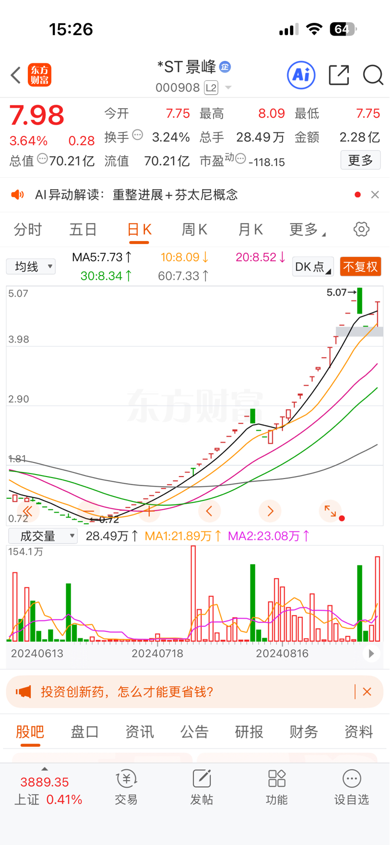 再给你们看看我去年经历过的景峰,我成本1.2,跌到了0.72也没吭声,一字板上来第一次开板是1.79元,涨到了6元多走的,今年最高点9.48元~