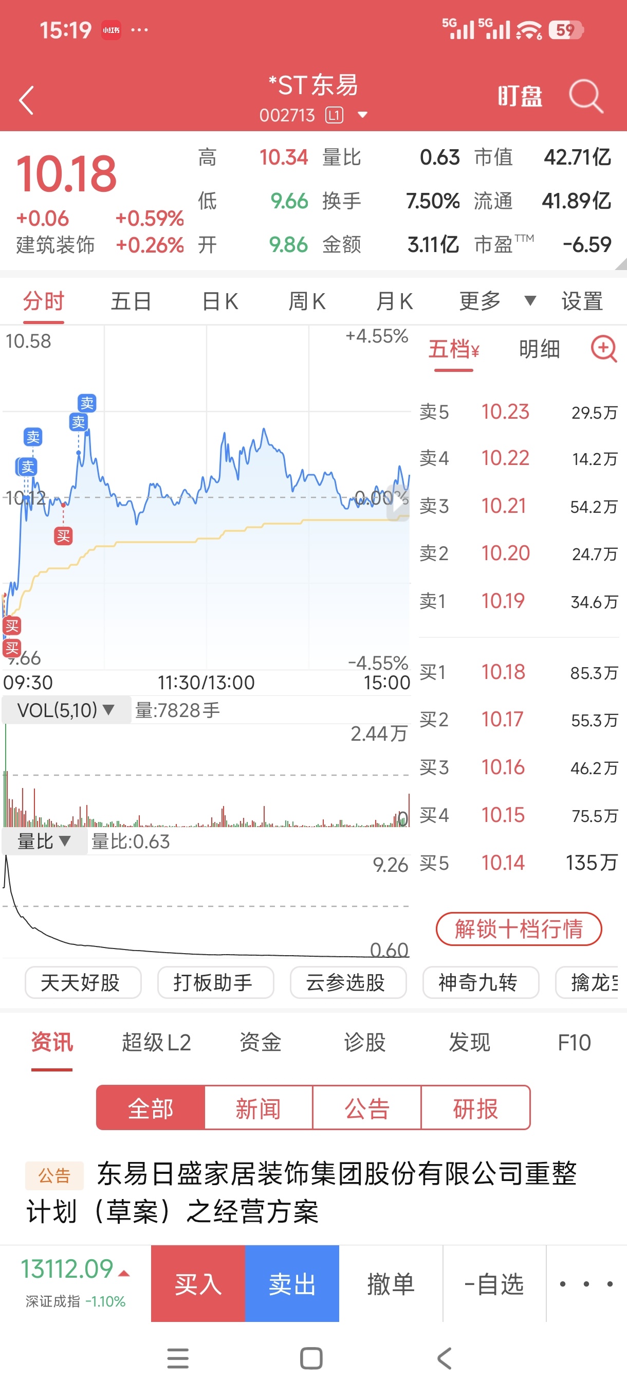 $*ST东易(SZ002713)$ 收盘集合竞价涨了4分抢盘了10.18一定要发,今天做了几波T降低成本,仓位减了一成半明天正平一定会开了,所有ST都会止跌回稳