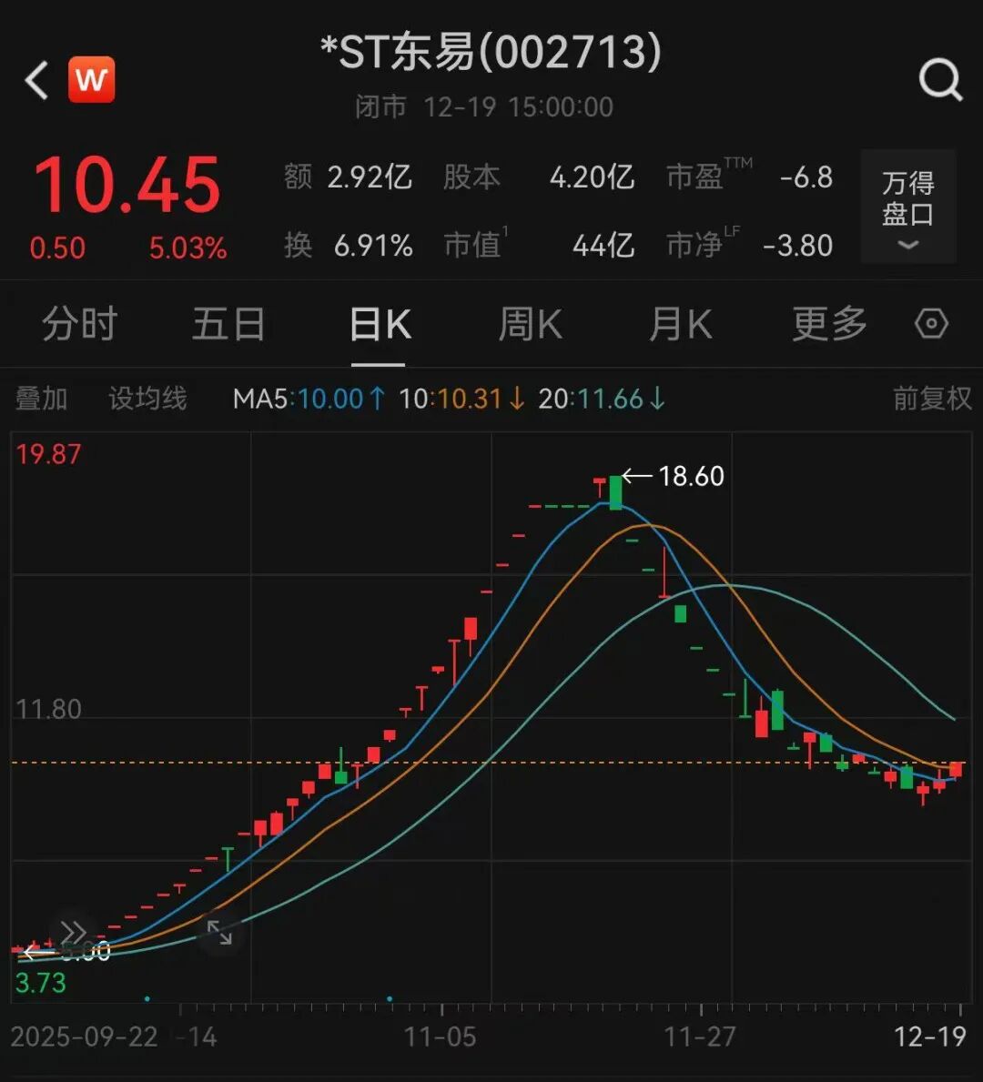 值得一提的是,9月以来,*ST东易股价出现大幅波动。在走出“12连板”后,11月14日起,*ST东易停牌核查。11月19日复牌当日,公司股价涨停,报18.54元/股。但从11月20日开始,公司股价一路下跌,Wind数据显示,截至12月19日收盘,公司股价报10.45元/股。