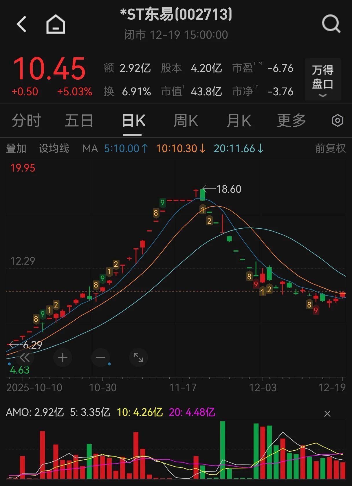 盘面上,自9月26日公司披露遴选重整投资人结果以后,该股迎来大幅上涨,创下29个交易日收获24次涨停的纪录,股价从9月26日的5元附近一路上涨,于11月20日触及18.6元高点,不过此后该股连续回调,截至最新收盘,报收10.45元/股。
