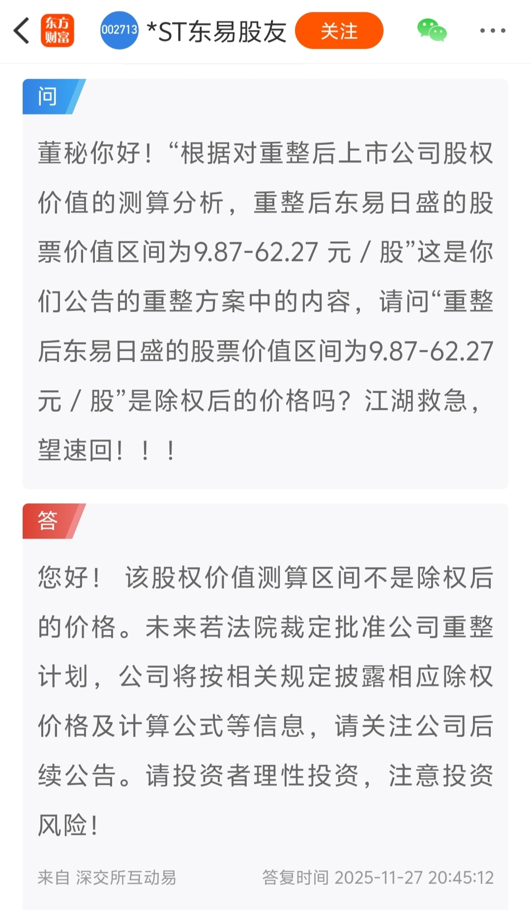 $*ST东易(SZ002713)$ 东易重整顺利通过执行,看来之前公告说未来股价在9.87--62.27是有依据的,放手一搏吧,只要有机会就加仓干它
