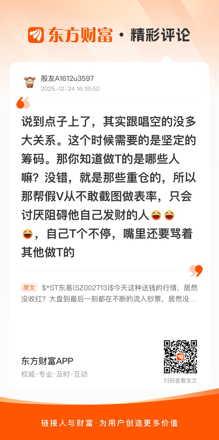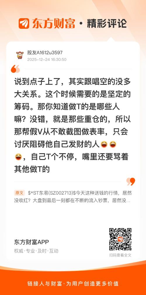 //@股友A1612u3597 : 说到点子上了,其实跟唱空的没多大关系。这个时候需要的是坚定的筹码。那你知道做T的是哪些人嘛?没错,就是那些重仓的,所以那帮假V从不敢截图做表率,只会讨厌阻碍他自己发财的人