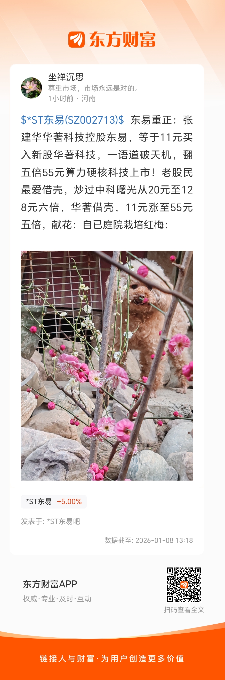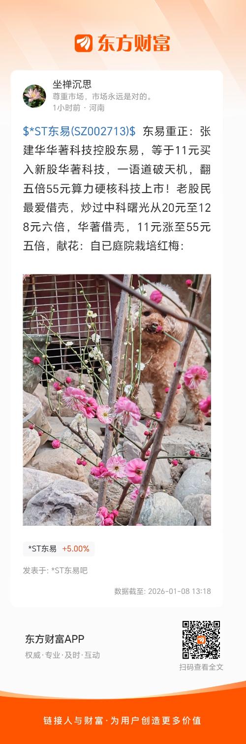 $*ST东易(SZ002713)$ 东易重正:张建华华著科技控股东易,等于11元买入新股华著科技,一语道破天机,翻五倍55元算力硬核科技上市!老股民最爱借壳,炒过中科曙光从20元至128元六倍,华著借壳,11元涨至55元五倍,献花:自已庭院栽培红梅:
