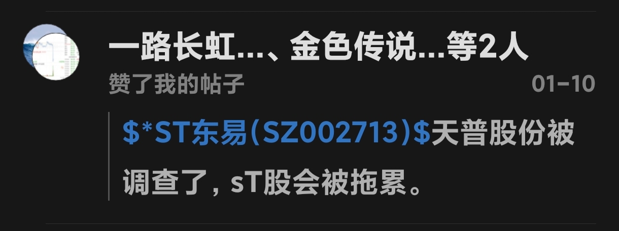 $*ST东易(SZ002713)$ 我之前说过天普股份被调查会带坏sT股都不相信