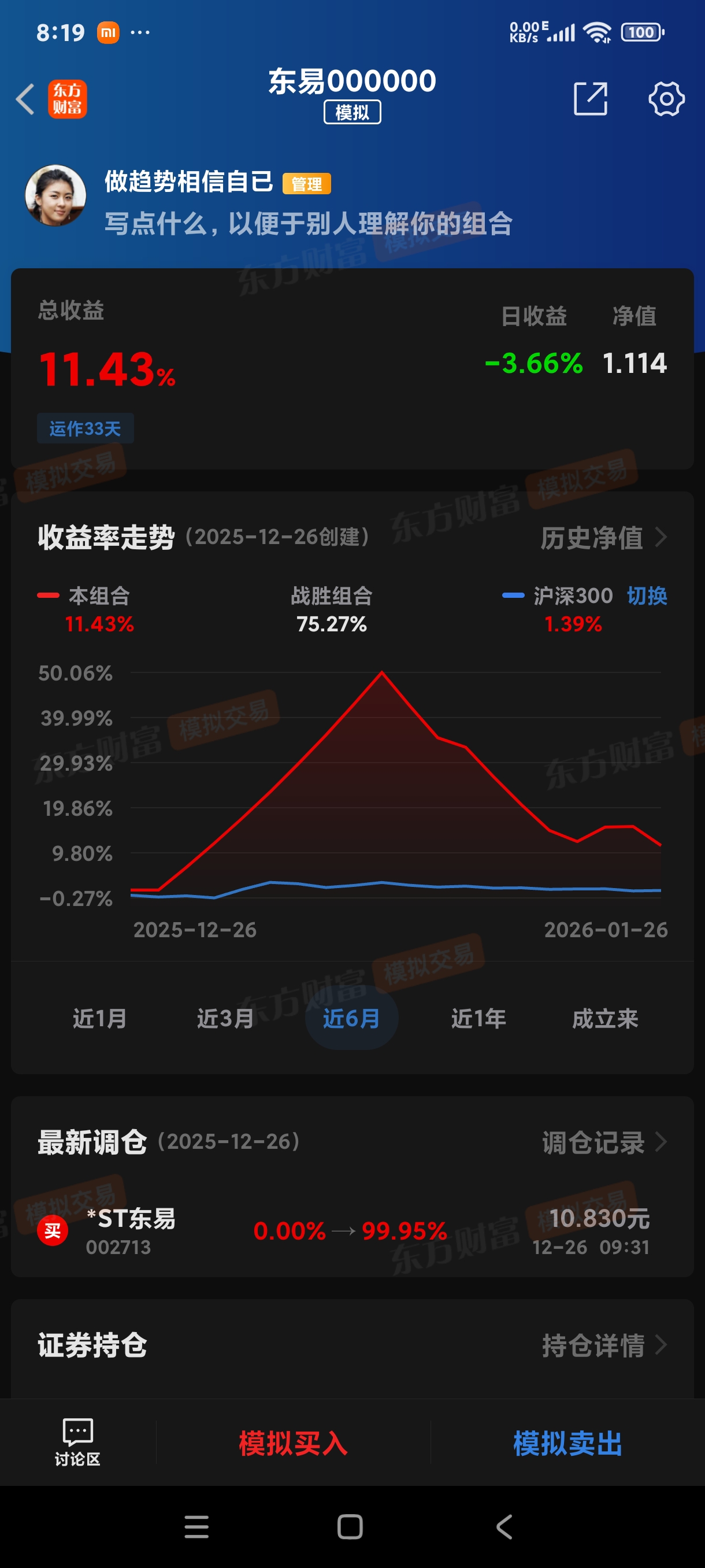 $*ST东易(SZ002713)$ 我精神上支持一下。买入sT东易的模拟盘
