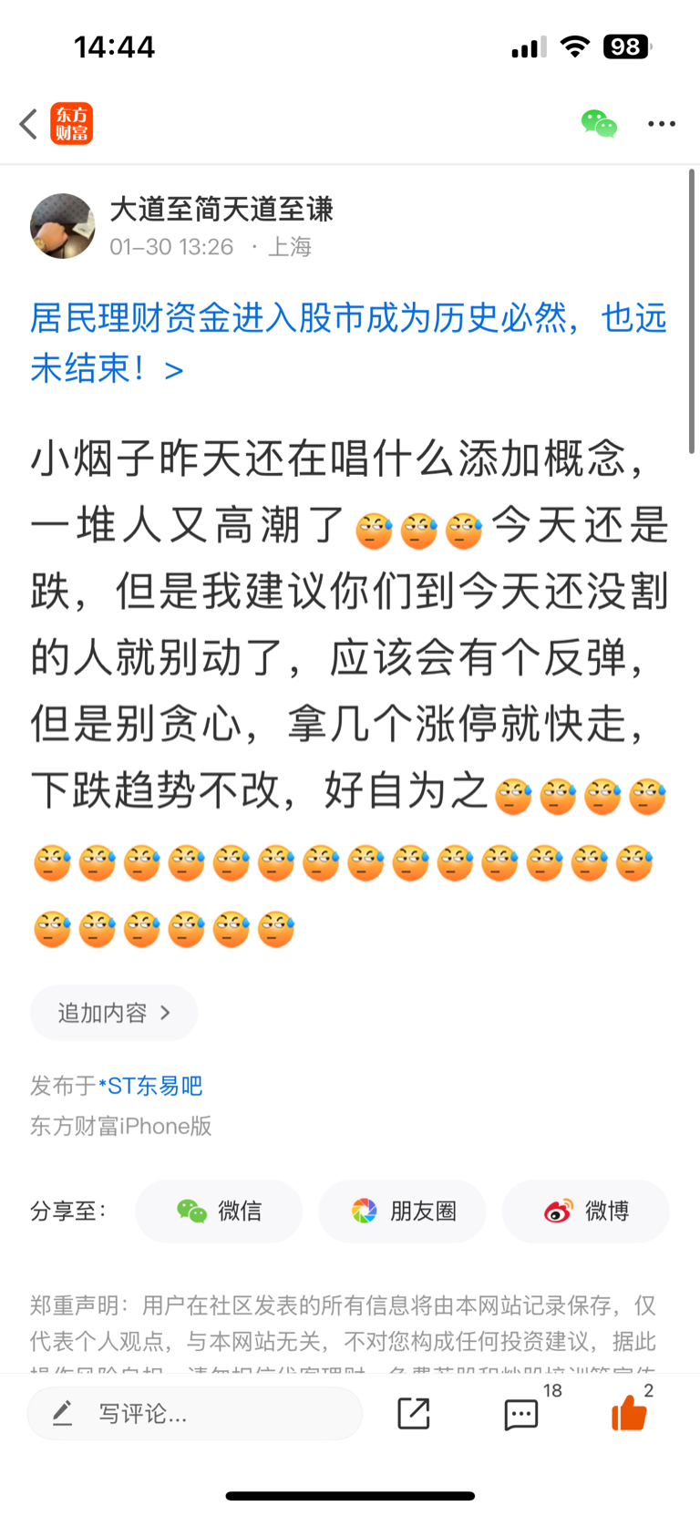 温馨提示: 1.根据《证券法》规定,禁止编造、传播虚假信息或者误导性信息,扰乱证券市场;2.用户在本社区发表的所有资料、言论等仅代表个人观点,与本网站立场无关,不对您构成任何投资建议。用户应基于自己的独立判断,自行决定证券投资并承担相应风险。《东方财富社区管理规定》