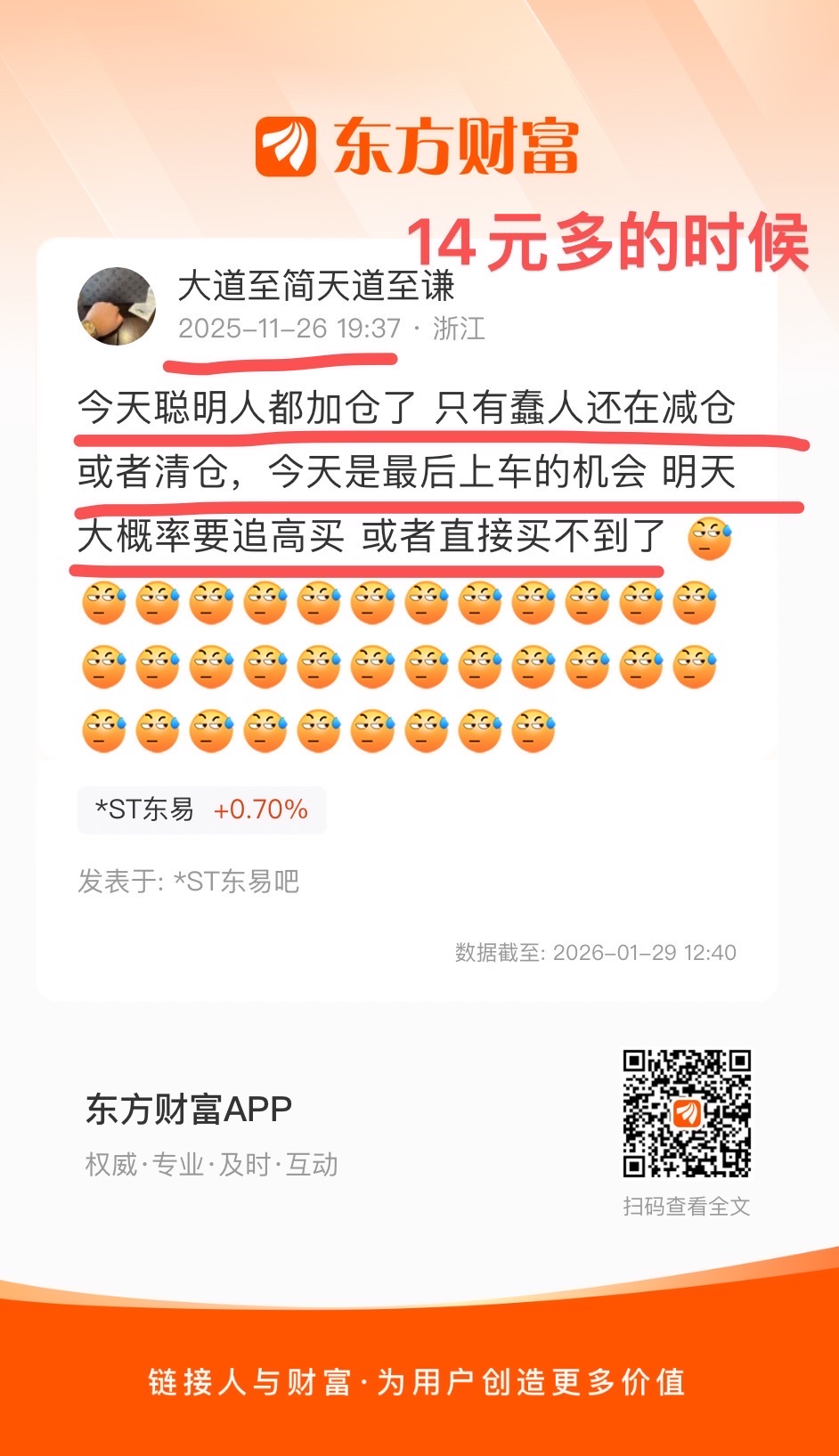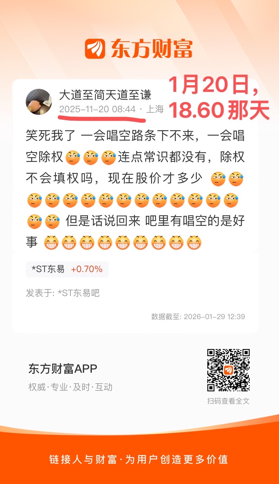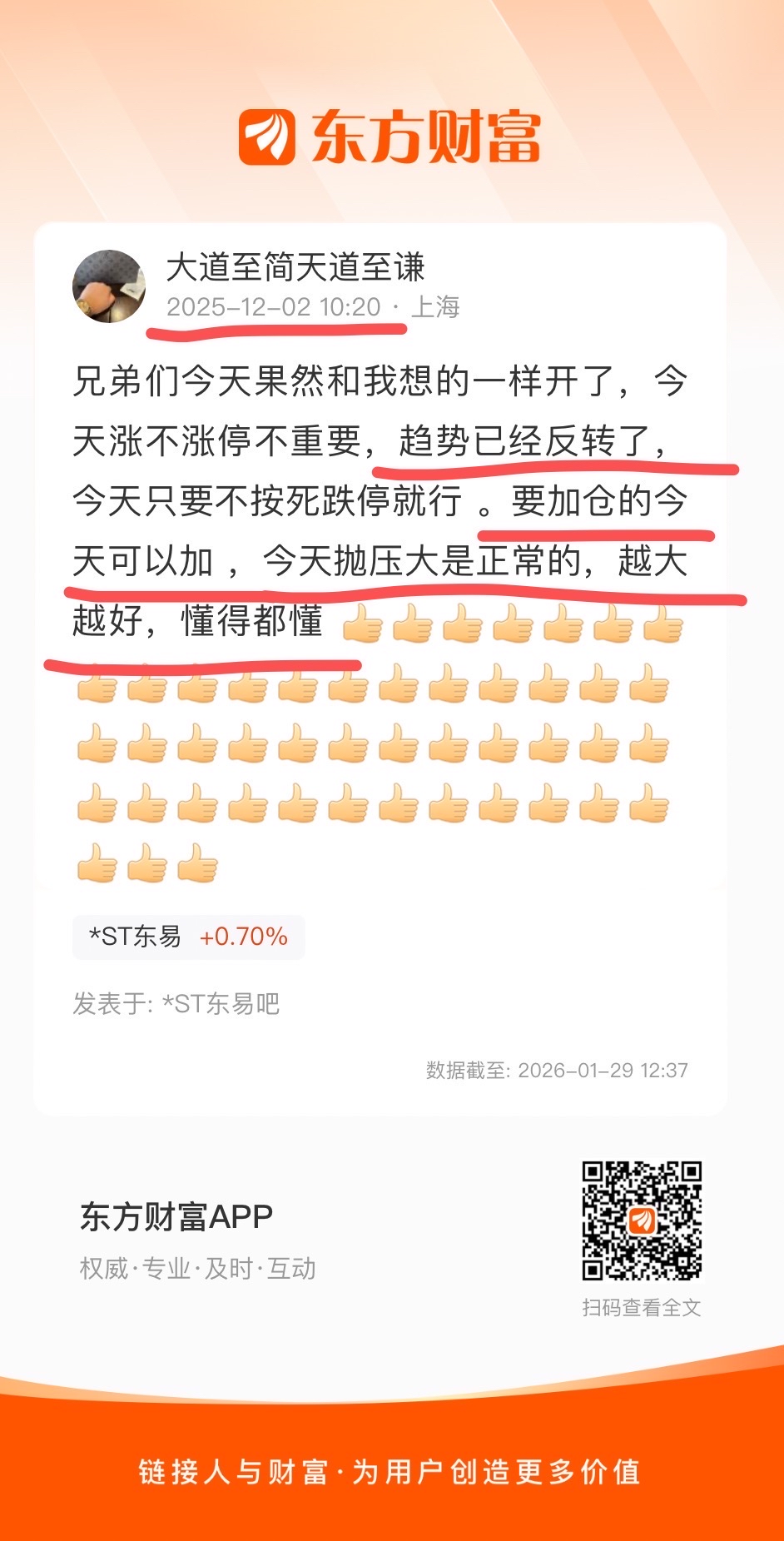 他傻呵呵的捧着一个碎屏的手机,在东易股吧跳大神。