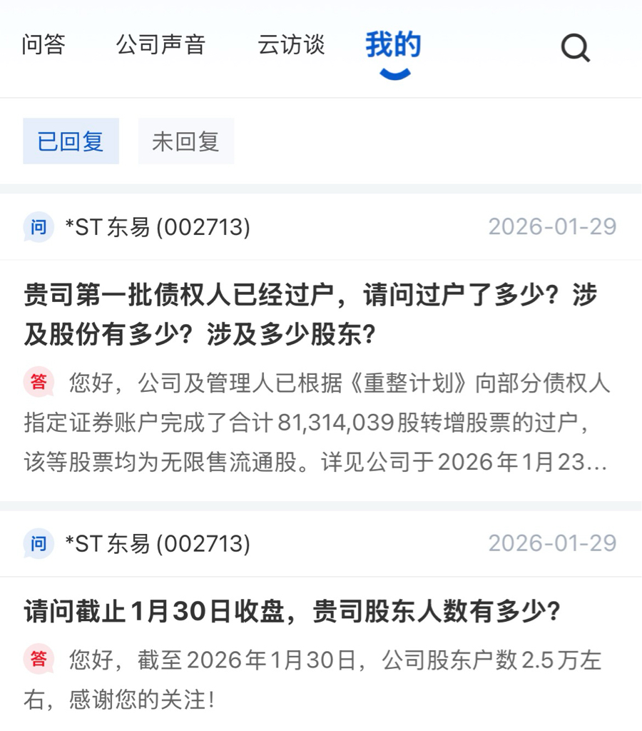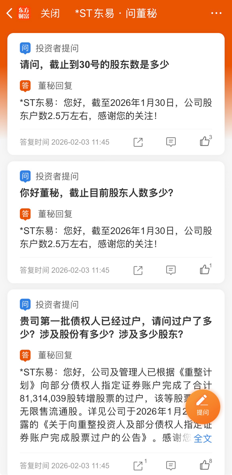 $*ST东易(SZ002713)$ 我在19号问了好多问题,董秘在3号回答了这些。其次,还问了大家关心的一些利好,比如廊坊厂房的事、大股东捐赠的事等等,截止9号,尚未回答。大家多打董秘电话或者在浪潮互动提问,不要天天瞎猜,臆想,盲从,做一只股票,一定要自己花功夫做功课的。附图,已回答你