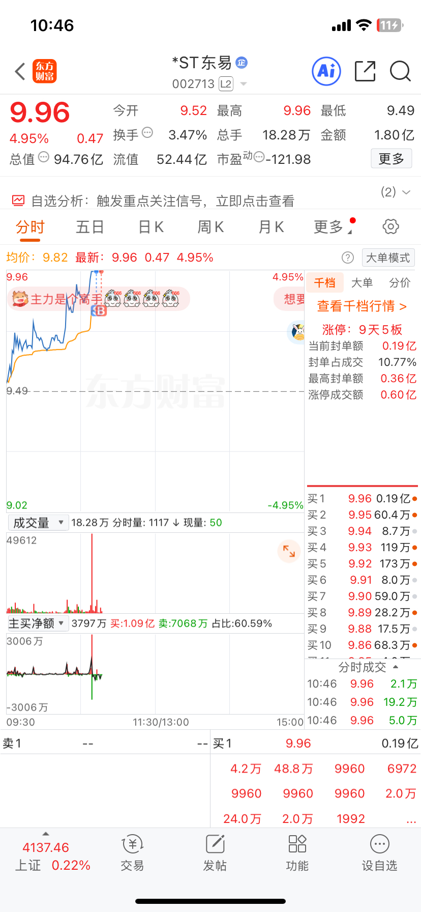 $*ST东易(SZ002713)$ 卖了,感觉不对又买回来了,T了个寂寞