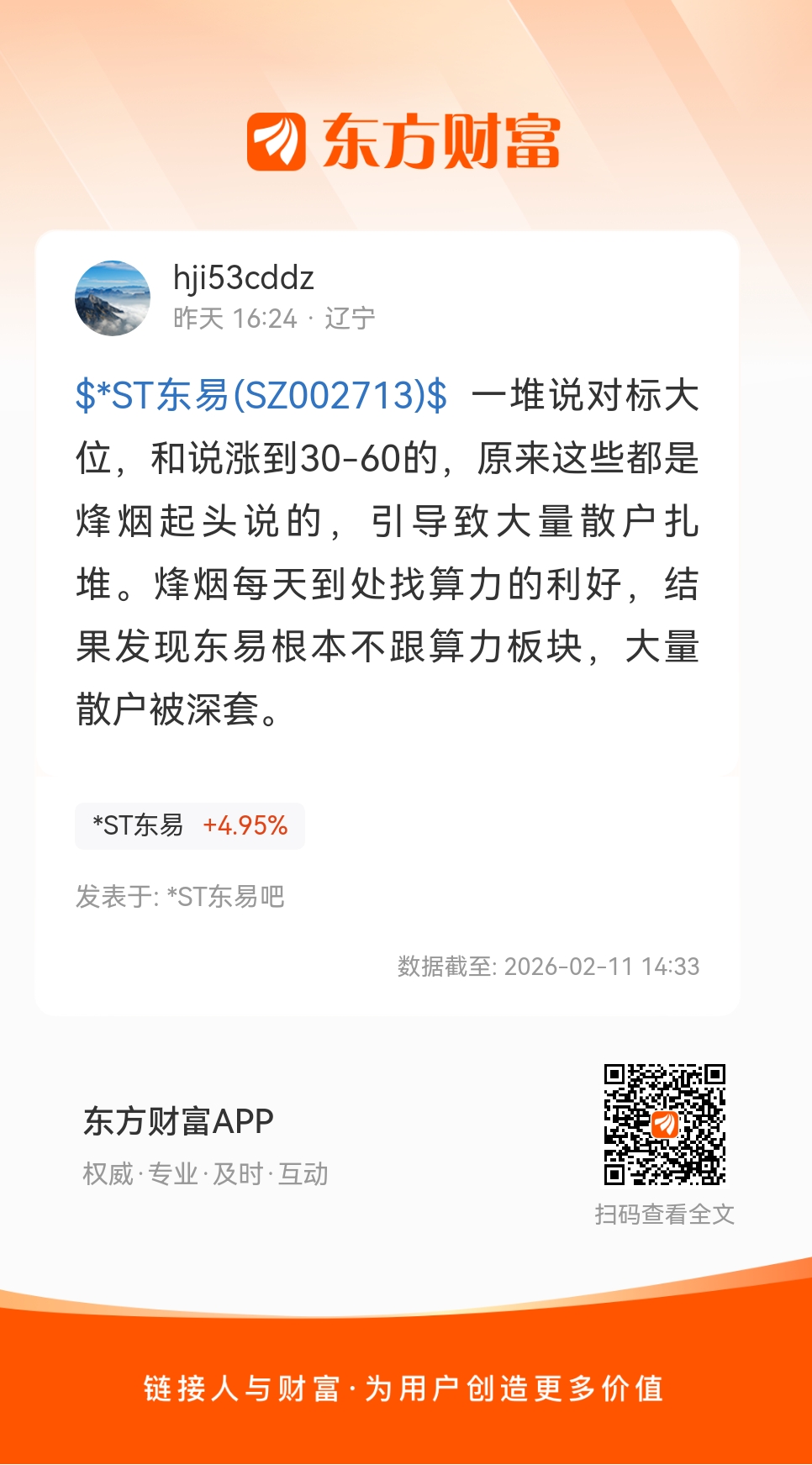$*ST东易(SZ002713)$ 一堆说对标大位,和说涨到30-60的,原来这些都是烽烟起头说的,引导致大量散户扎堆。烽烟每天到处找算力的利好,结果发现东易根本不跟算力板块,大量散户被深套。