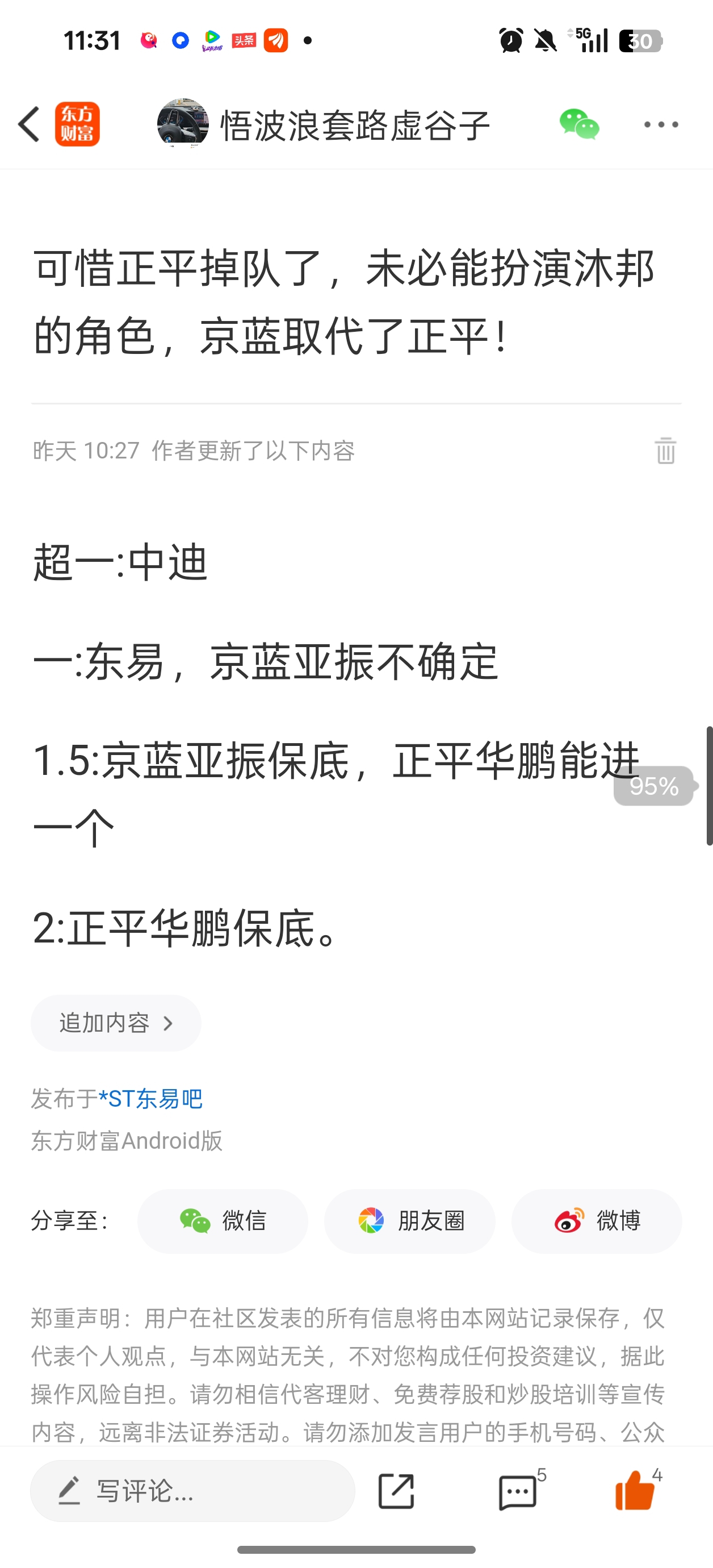 $*ST东易(SZ002713)$ $ST中迪(SZ000609)$ $ST京蓝(SZ000711)$ 和昨天判断的强度榜类似,本周确定京蓝东易1梯队,亚振华鹏1.5梯队,正平靠潜力走后门进2梯队!中迪暂超1梯队?嘉美的性价比已经和ST差不多就,涨的不会顺利,考虑波动性,还是半仓以上早ST了!