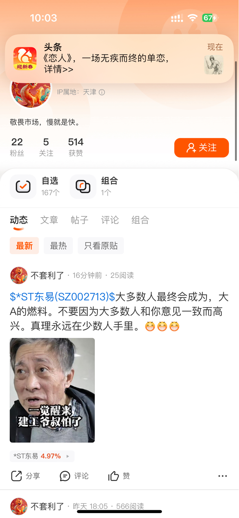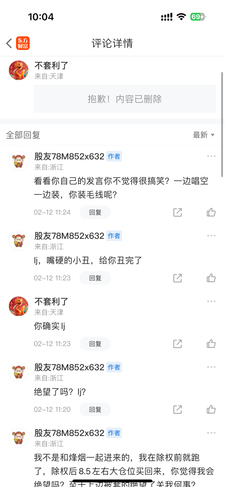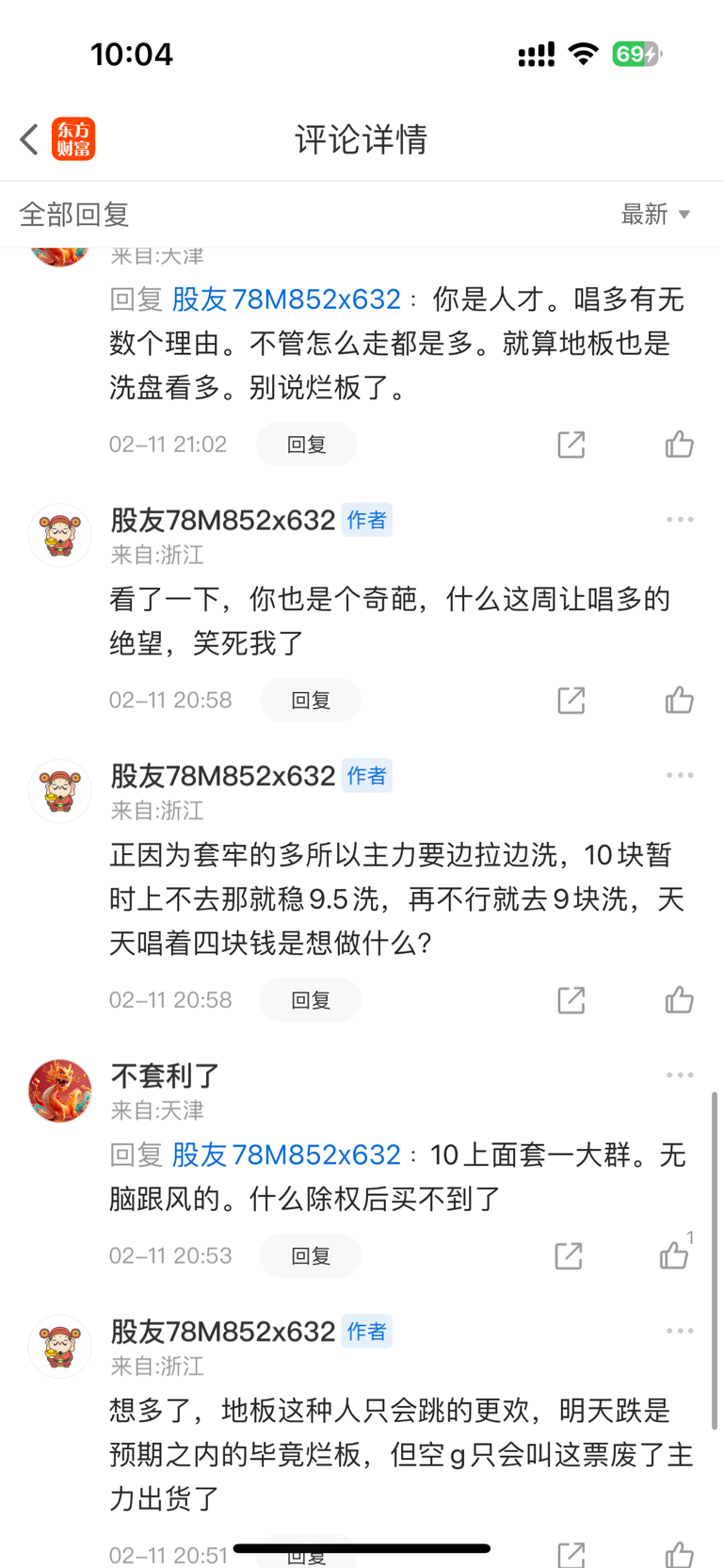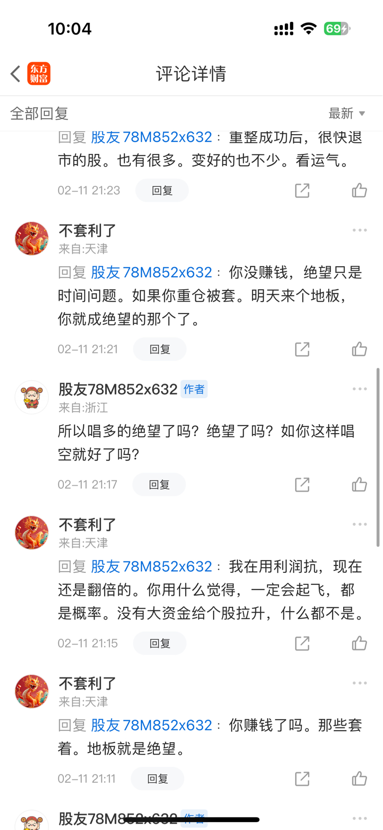 $*ST东易(SZ002713)$ 这空g也是极品,之前被我怼的给我拉黑了,今天一看怎么能看见他信息,原来是给我解了,这玩意年前一周那天周五说,下周让唱多的人绝望,被我看到后还删了帖当做没发过,2.11涨停烂板后我就怼他“我绝望了吗?