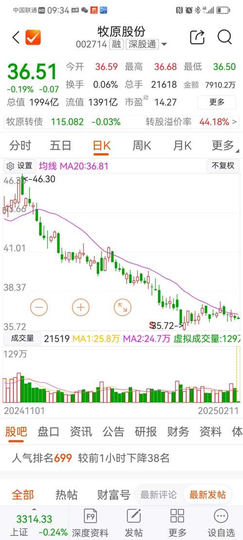 牧原股份股价继续震荡下跌,本周股价会创近期新低,本周创新低后未来会继续震荡下跌到30元下方。