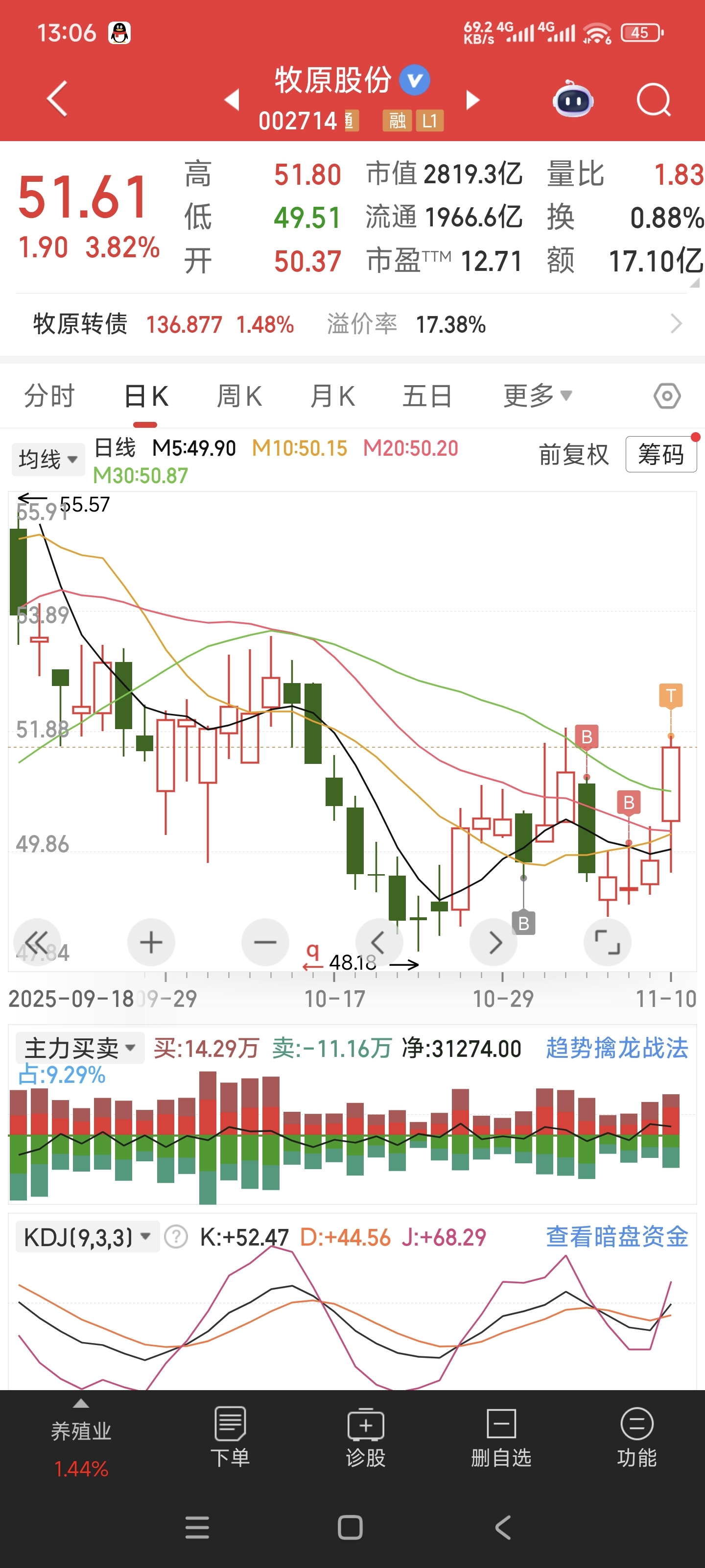 牧原养猪的成本价大概六块钱左右,那生猪价格低于六块的时候就能买,最简单的就是人家