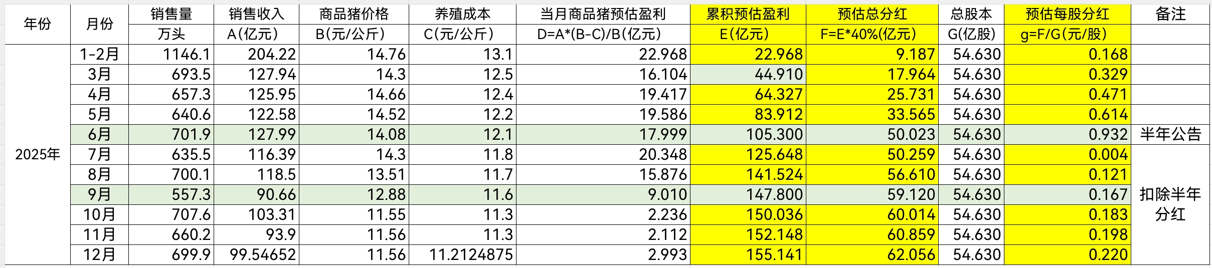 $牧原股份(SZ002714)$ 依据已经公告的销售情况,预估今年销售总量近7800万头,接近年初销售目标上限。按照已发布相关数据推估,2025年年报分红每股0.22元。
