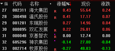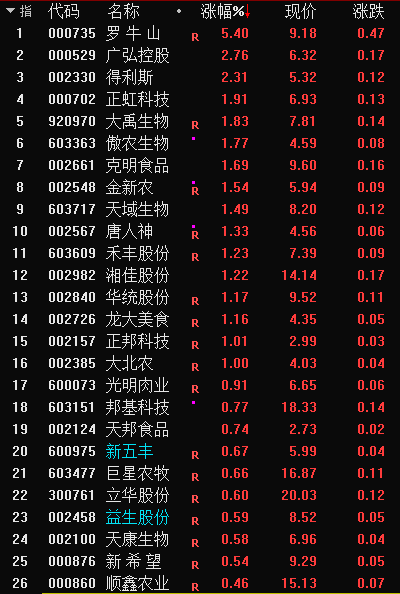 盘面看,33家猪肉股仅神农集团与牧原股份收跌、京基智农平盘外,其余不同程度收涨。罗牛山涨5.40%,广弘控股、得利斯分别劲升2.76%、2.31%,正虹科技、大禹生物、傲农生物等13股涨幅逾1%。