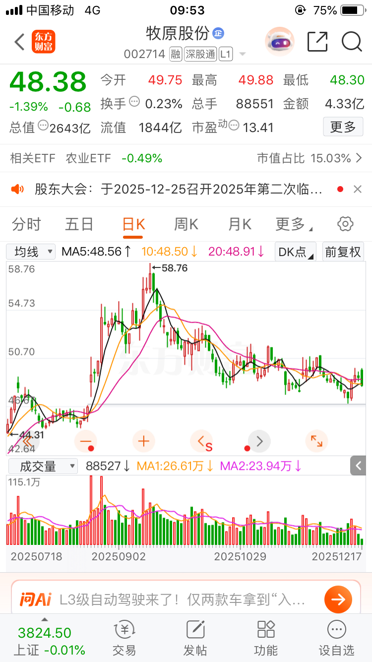 $牧原股份(SZ002714)$ 嗯哼,昨天官方宣布生猪进口关税由原4.9%提升至19%,浙江只接受1000公里内的猪源,这些都是利好于河南生猪的,然而,今早竞价高开诱多,开盘大幅往下跳水,看来,利好与趋势,后者更可信,股价没有资本长线推,是起不来的。先观察一下,2026年1月再看。