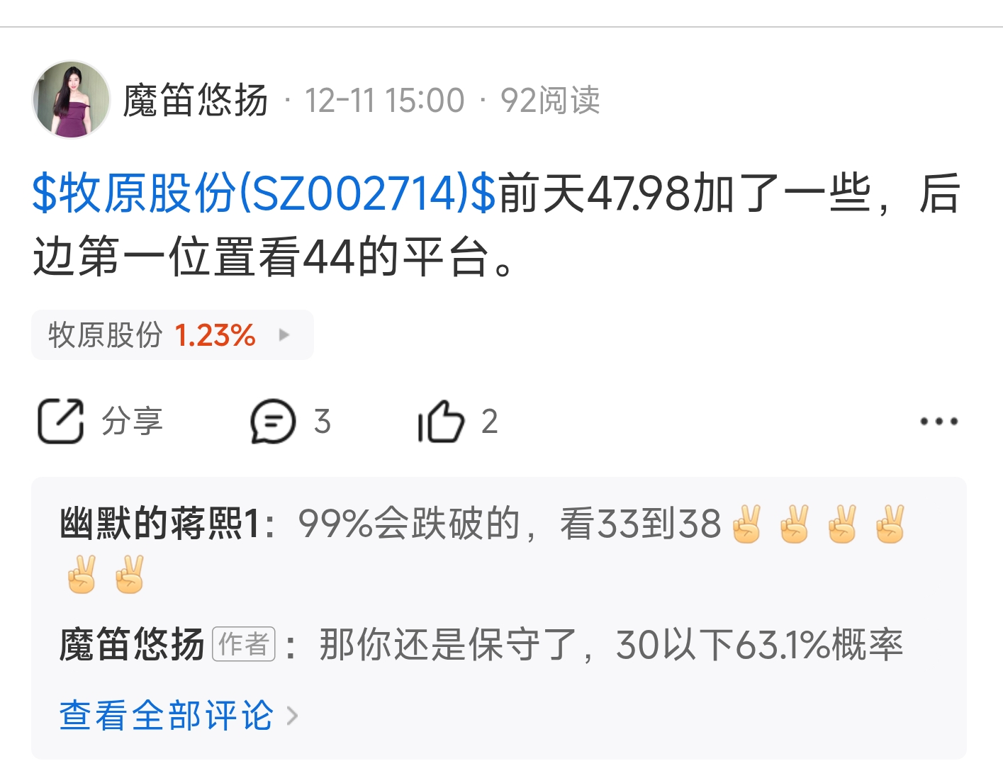 $牧原股份(SZ002714)$ 50.05出掉47.98加仓的部分,做个小T,下次回调低点附近再加,不给机会就三成仓位等风来,反转没来,绝不追高