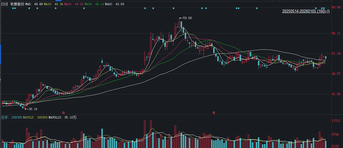 二级市场上,截至1月5日收盘,牧原股份下跌0.95%报50.10元/股,总市值约2736.85亿元,2025年公司股价全年累计上涨约35%。