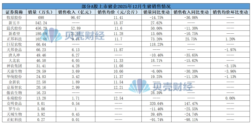 部分A股上市猪企2025年12月生猪销售情况。新京报贝壳财经记者阎侠制图