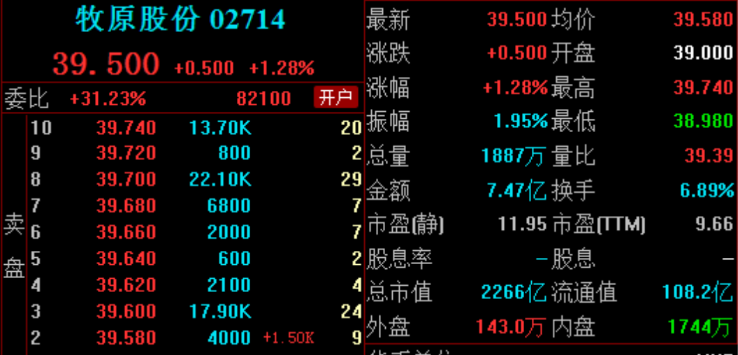 截至发稿,牧原股份港股上涨1.28%,报39.5港元/股,市值超2260亿港元。