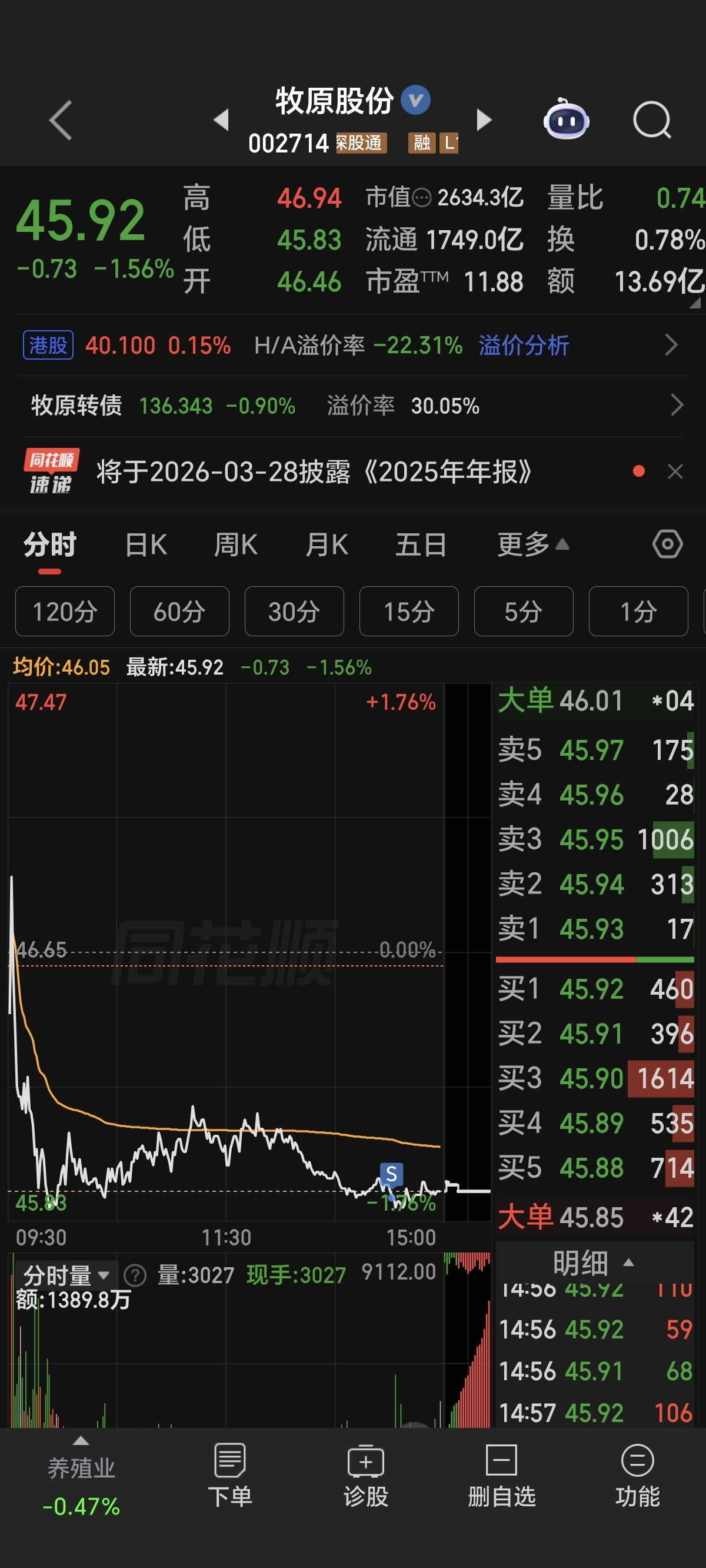 $牧原股份(SZ002714)$ 赔1.5个点,止损清仓休息,暂时不炒股了,干不过量化,认了!