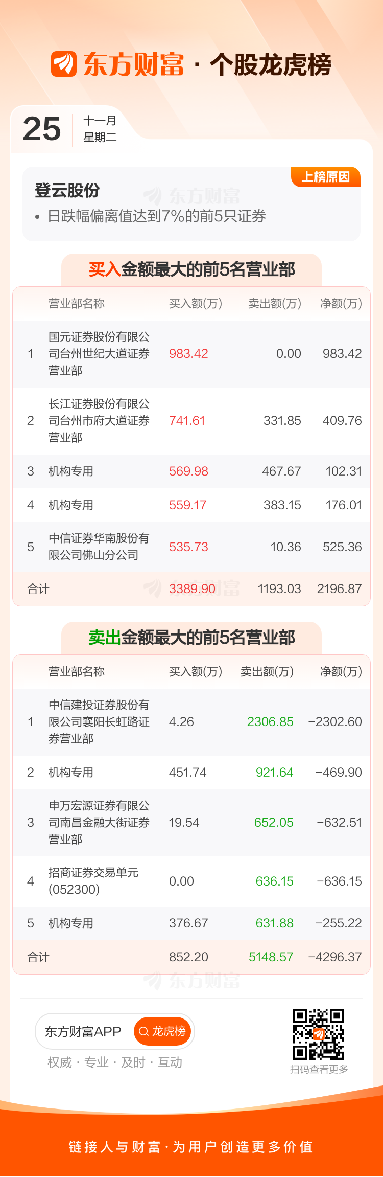 交易所2025年11月25日公布的交易公开信息显示,登云股份因成为日跌幅偏离值达到7%的前5只证券上榜。登云股份当日收报19.34元,涨跌幅-10.00%,偏离值-11.42%,换手率13.40%,成交额3.73亿。