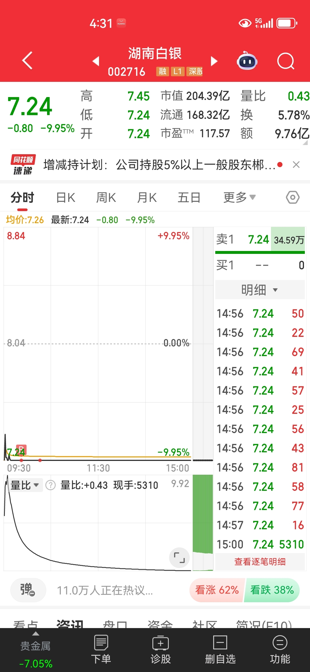 $湖南白银(SZ002716)$ 我倒是不信黄金白银行情就这么快结束了,买买买,买错也要买!至于减持,左手倒右手,郴州国资委卖给湖南矿业集团不香吗?公司还在回购呢!