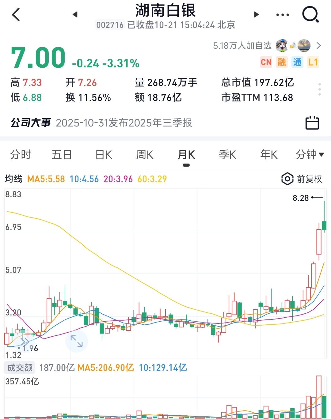 明天补涨,白银价格月线6%+,湖南白银股价-0.5%。