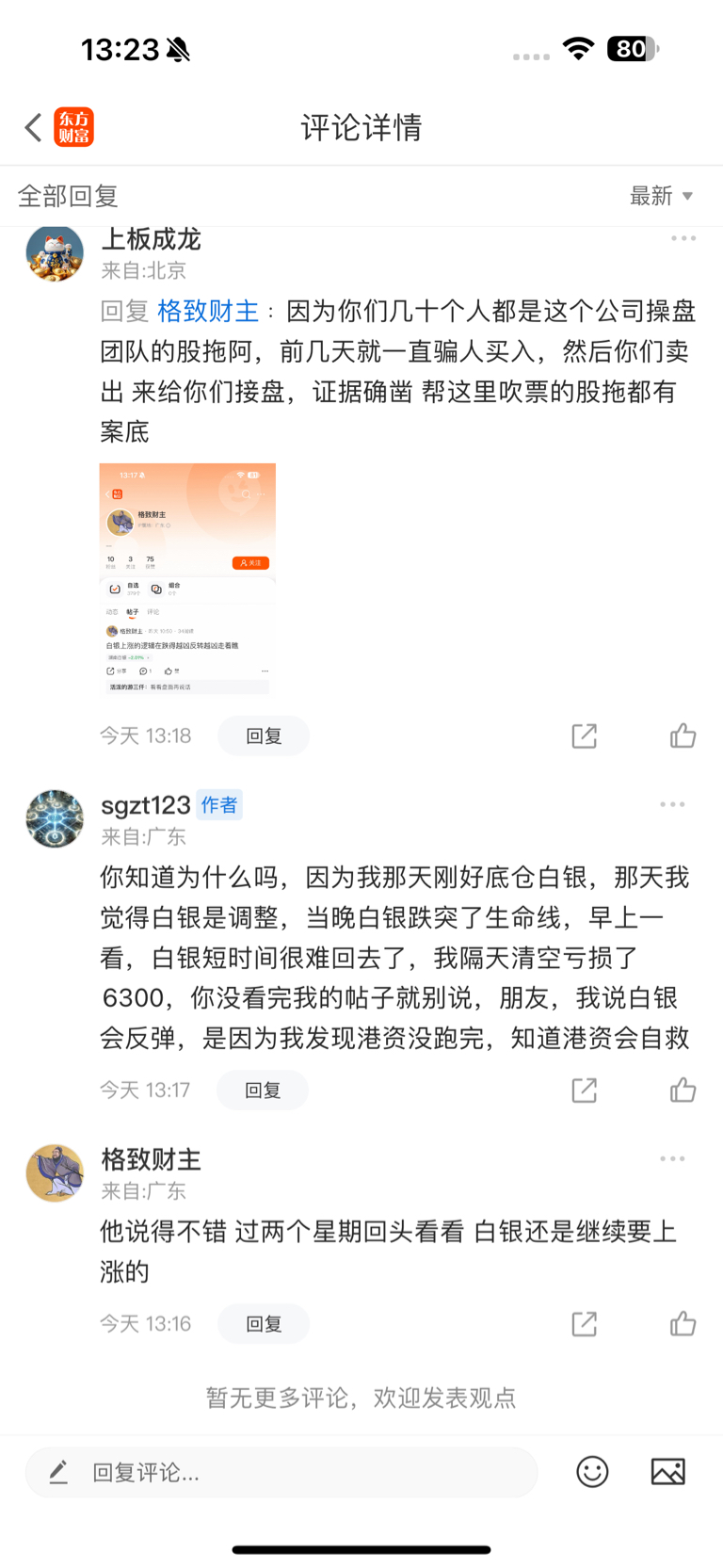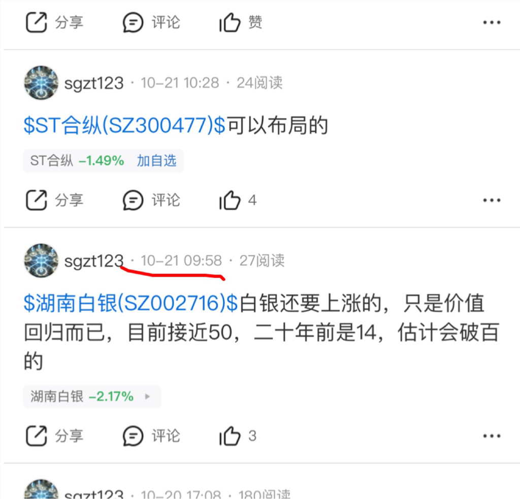 $湖南白银(SZ002716)$ 我已经整理了现在评论区下面小部分股拖,他们的共同特征就是昨天前天开始就用话术为这个公司股东出货抛盘掩护,引导大家来给他们接盘,我揭穿其中一个另一个还会帮忙解释,结果点开一看 也是同一家公司同一时间发过类似话术的股拖,证据确凿,无论他们如何解释自圆其说,这种产业链现象早给成为我们参考一只票是否合理的判断因素,从高位的时候就叫人接盘,跌了几天每天都叫,而且不止这支 是他们说的每一支当日可以买入的票,当日无论是涨是跌,次日必跌,所以我认为这应该是一家jg的团队,因为我同学以前就是jg出来的,里面确实有一个唱手部门,和电视剧里面一样,他们很早就利用大资金优势几个月前进入里面,然后开始拉升到何时位置 ,就启动唱手叫散户进来接盘,特别是他们抛盘吃力的时候来的唱手就越多,期间的套路是,由于这里没真的矿资源被炒上去后股东减持抛盘,但是如果一下子出完货会跌停 已经跌停了两天没人敢接盘了,出不了那么多货,所以公司先用小资金拉一波,骗人进来,高位进来接盘的人刚进来不久就跌了,跌了以后心里不甘心,又会想着往下买多一点,这样能降低成本,公司就是拿捏着你们这种心态他就可以出货了,因为你越是买入,越是补仓买进来的筹码就是他抛出去的筹码。不然为什么到漂亮那边两倍做空,他还敢投铁拉呢?不就是因为散户喜欢追涨总觉得自己能吃到一波肉,但是扪心自问你的交易生涯最早和所谓的抄底底是不是亏得更多一些?因为你们都不结合其他地方的市场去判断,而是凭着感觉用一股赌徒的心态去交易,大家都知道赌徒是没有救的,为什么轮到自己身上的时候意识不到呢?今天唯一能做的就是跑,跑的比股东快、不要有不甘心和任何留恋。我们玩不过这些产业链