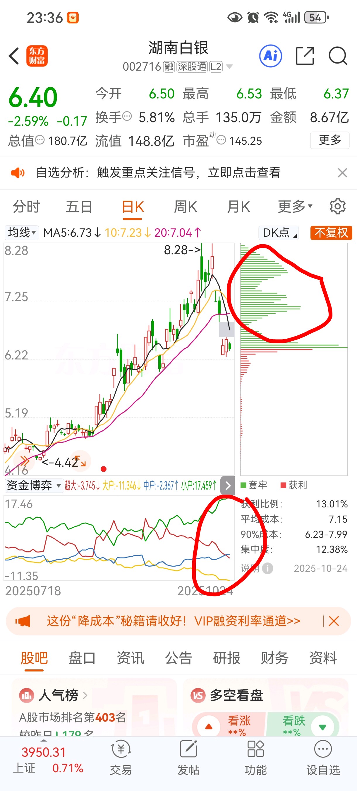 新发的这张图,就是我为啥说,白银还要大概率下周震荡的为主的原因,虽然长期看好它肯定会回8元以上,但是短期不见转机,资金消耗不起时间呀,所以短暂离场博弈其他热股。就像我画的2个,右上角那个第一个截止现在套牢盘牢牢锁死,谁都明白,只要拉伸,套牢盘肯定第一时间跑路。。主力又不傻,它好不容易离场了,它会重新回来给咱们抬轿子?左下角那个,更简单这几天的超大和大主力一直在偷偷跑,小散在一直进。在高套牢盘的情况下,小散在不停进来自救。但是主力还有获利盘早就跑没了。。。中国有句话叫无利不起早,他们都挣钱跑了,没有新的大利好和转机肯定轻易不会再进来。所以他们也在等时机,那么问题来咯,这时机的“时”在“机”前面,但是咱们现在小牛市,谁有大把时间能白耗呀,别说10天了,可能2-4天你都要拍大腿了。