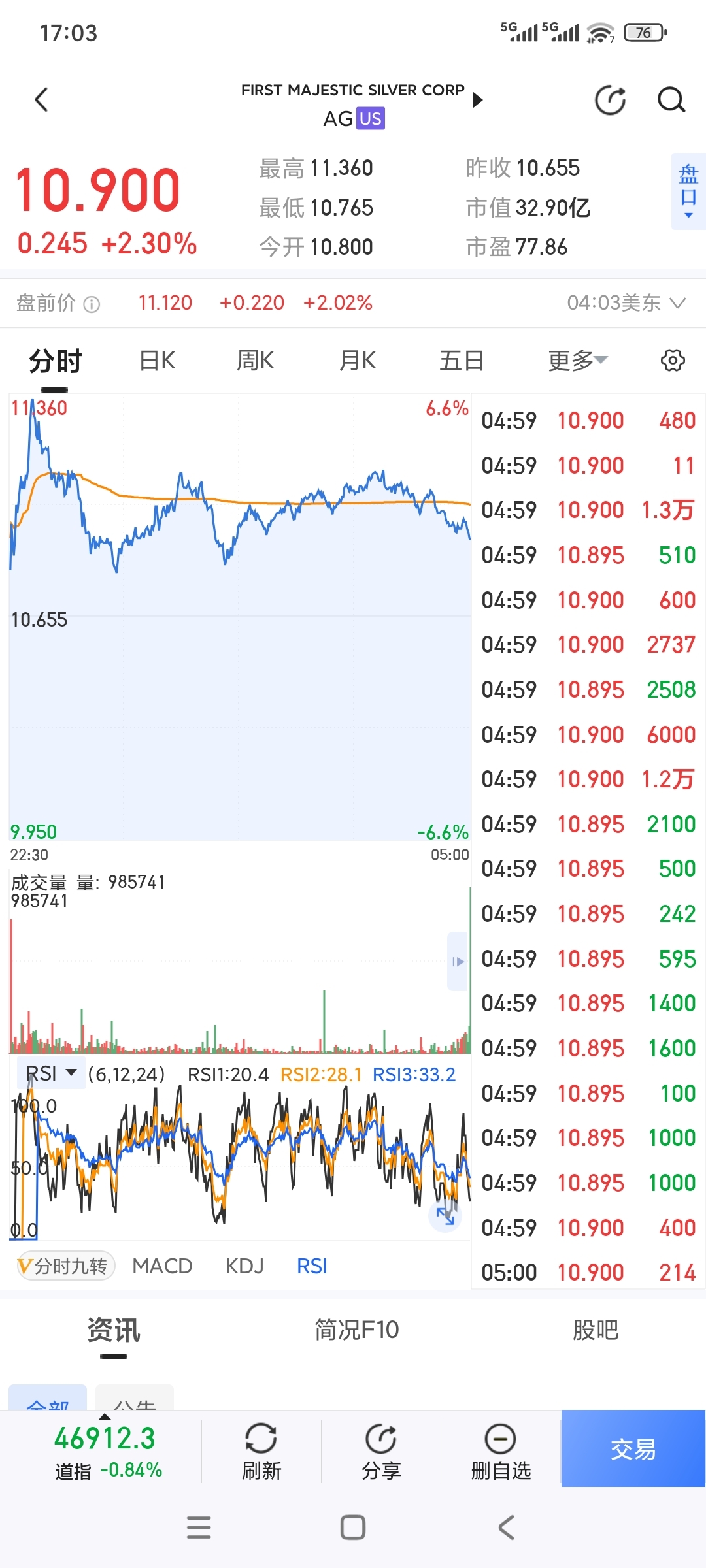 $湖南白银(SZ002716)$ 美股涨了,明天早上看这个就好