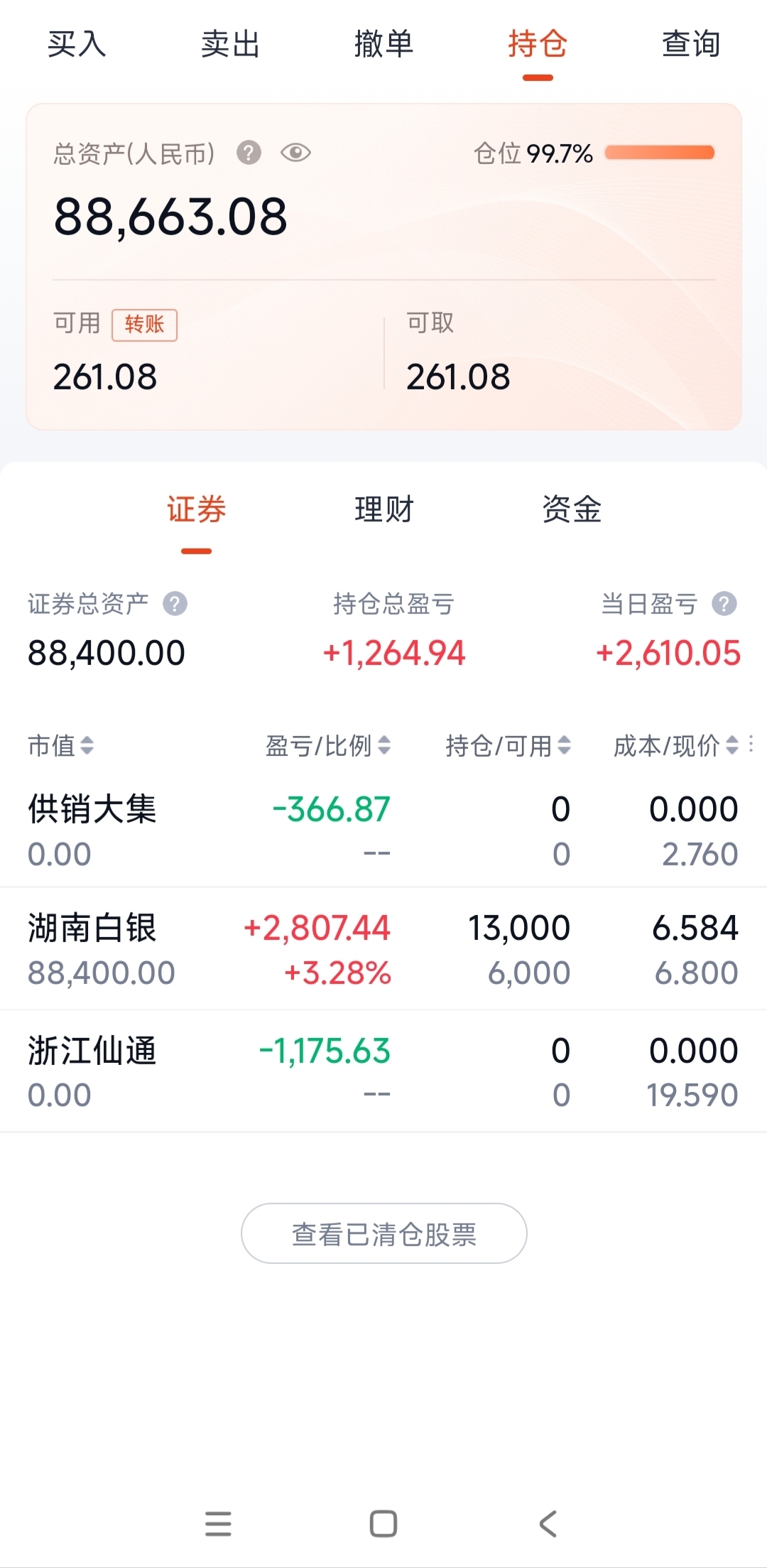 今日大盘总算回暖,可$供销大集(SZ000564)$ 与$浙江仙通(SH603239)$ 依旧延续低迷态势。恰逢昨晚现货白银大幅拉升,$湖南白银(SZ002716)$ 今早高开高走、红盘亮眼,我果断清仓了表现疲软的供销大集和浙江仙通,全仓切入湖南白银。总算终结了此前的7连跌,今日顺利盈利!期待明天湖南白银能乘势而上,延续亮眼表现。