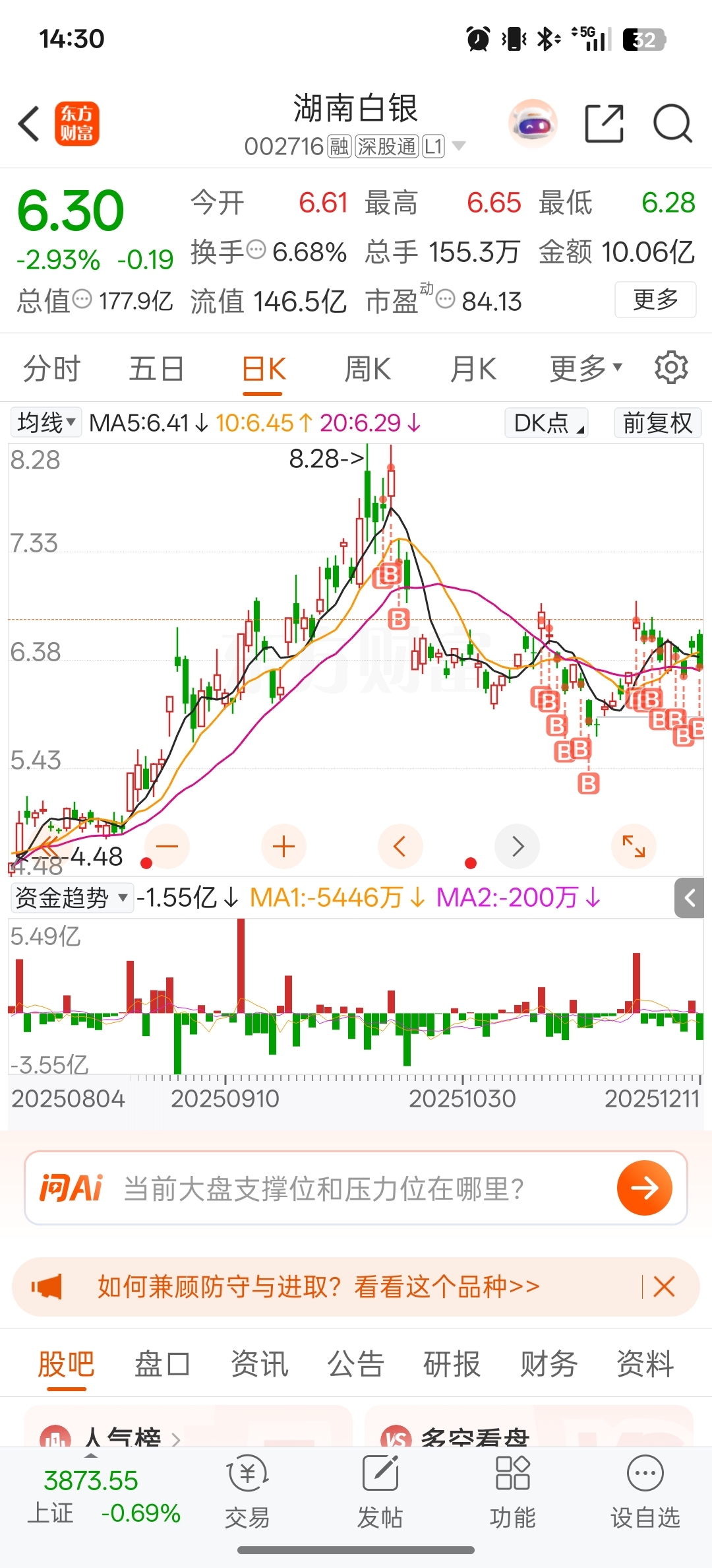 $湖南白银(SZ002716)$ 心态崩了 6.8的成本,回本就行了,天天跌2-4个点,谁能受得了