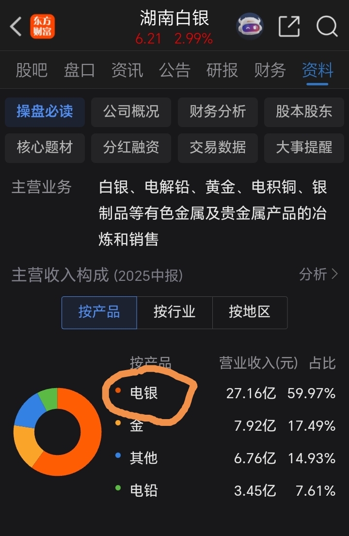 $湖南白银(SZ002716)$ 主产品电解银,上半年27亿