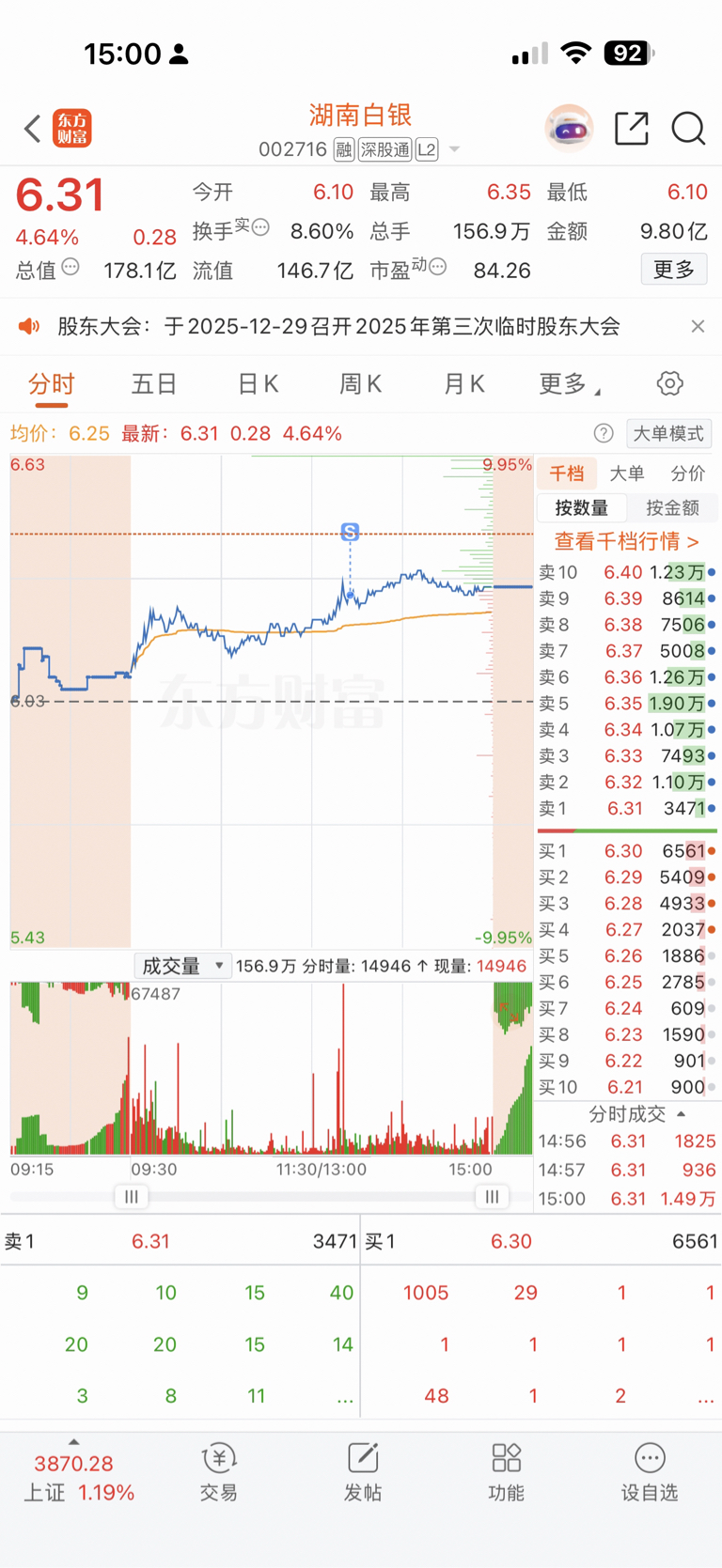 $湖南白银(SZ002716)$ 卖飞了?上去怎么不下来了