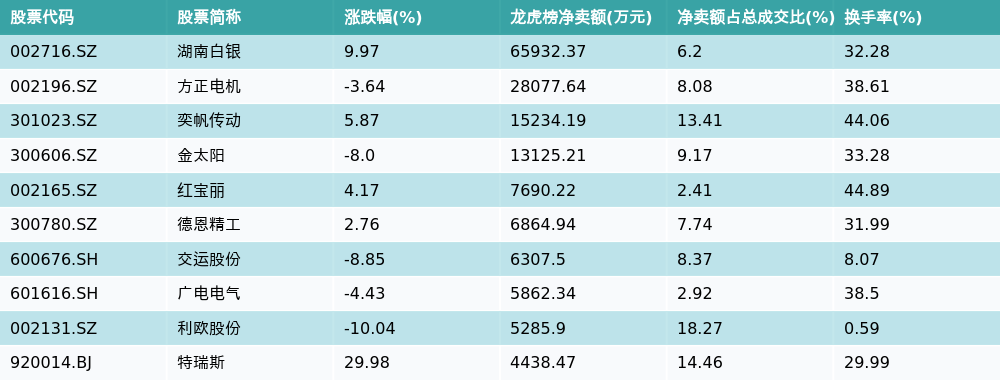 南财智讯1月22日电,南财金融终端数据显示,因当日异动登上龙虎榜的个股中,龙虎榜中资金净流出最多的前三位分别是湖南白银(002716.SZ)、方正电机(002196.SZ)与奕帆传动(301023.SZ)。其中排名第一的湖南白银被净卖出6.59亿元,占总成交金额的6.2%。湖南白银收盘上涨9.97%,换手率为32.28%。净卖出额前10个股详情见下图: