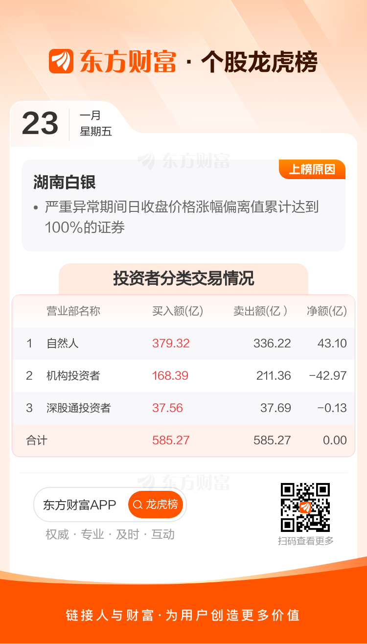 交易所2026年1月23日公布的交易公开信息显示,湖南白银因成为严重异常期间日收盘价格涨幅偏离值累计达到100%的证券上榜。湖南白银当日收报16.44元,涨跌幅9.60%,换手率25.85%,成交额97.18亿。严重异常期间1月12日至1月23日,期间涨幅108.10%,累计偏离值104.86%,区间成交额585.27亿。