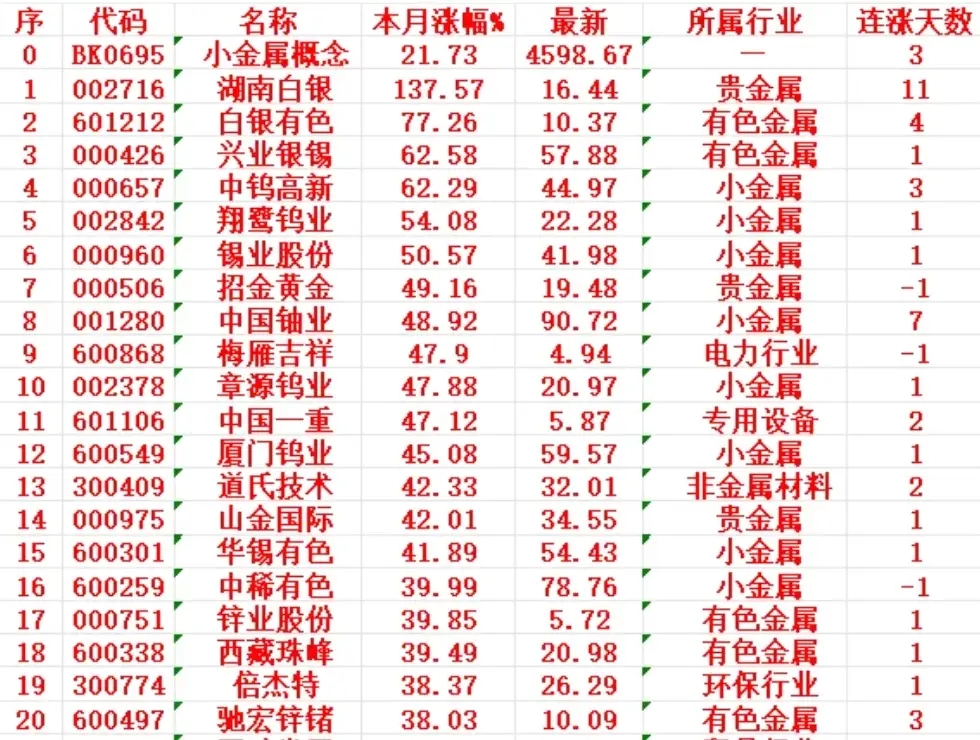 #强势机会# 小金属概念,一月以来涨幅最多的20名单汇总一览
