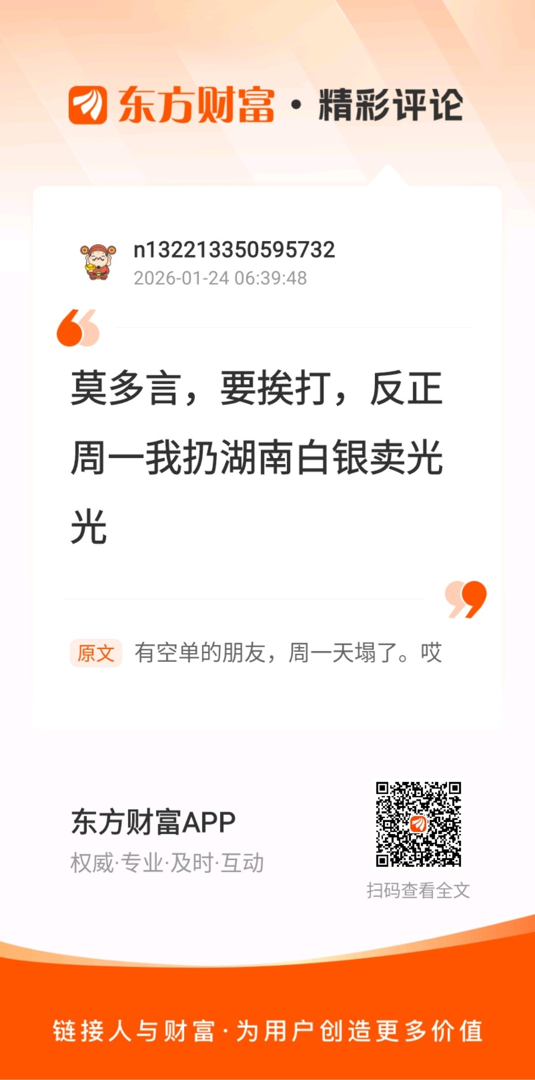温馨提示: 1.根据《证券法》规定,禁止编造、传播虚假信息或者误导性信息,扰乱证券市场;2.用户在本社区发表的所有资料、言论等仅代表个人观点,与本网站立场无关,不对您构成任何投资建议。用户应基于自己的独立判断,自行决定证券投资并承担相应风险。《东方财富社区管理规定》