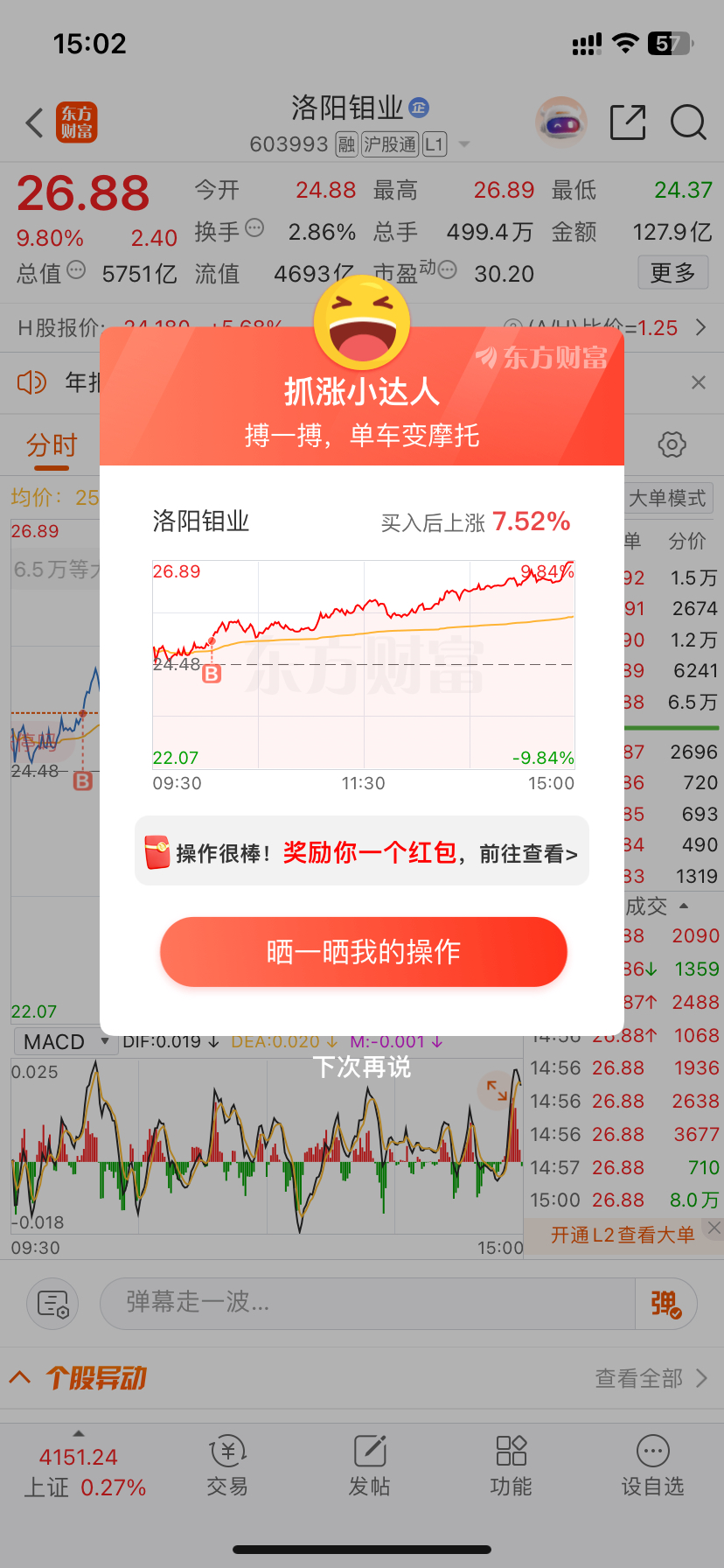 半仓湖白、半仓洛阳钼业,今天单车变摩托!