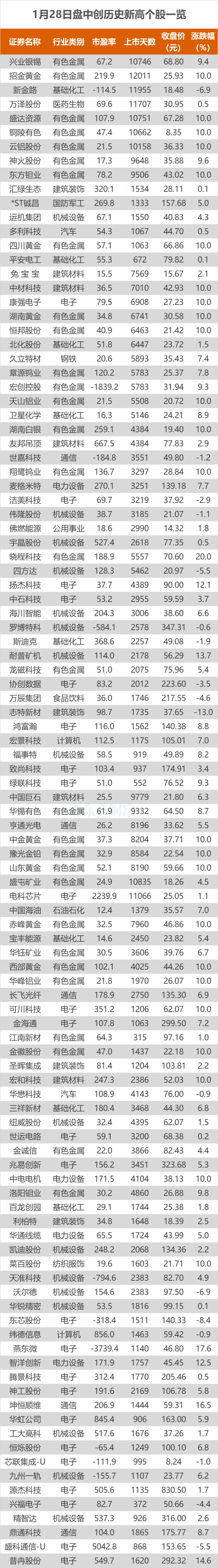 1月28日,A股三大指数今日涨跌不一,截止收盘,沪指涨0.27%,收报4151.24点;深证成指涨0.09%,收报14342.89点;创业板指跌0.57%,收报3323.56点。东方财富Choice数据显示,今日有107只个股盘中股价创历史新高,分别为湖南白银、铜陵有色等。