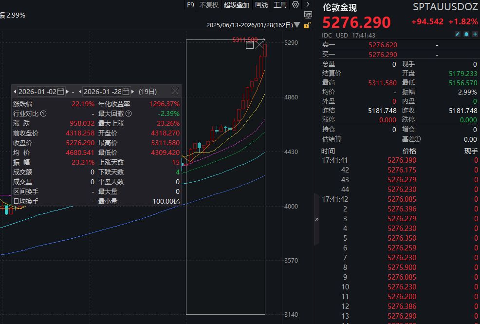 据Wind金融终端,北京时间1月28日16:30左右,美元计价的现货黄金一度触及5311.58美元/盎司,日内涨幅一度达到2.51%,续创历史新高。2026年开年以来,现货黄金累计涨幅已超过22%。
