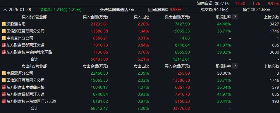 今日,湖南白银午后再度涨停,截至收盘仍有7777.74万元封单额,全天成交94.16亿元,换手率21.68%。当日,沪深交易所公布的交易公开信息显示,湖南白银因涨幅偏离值达7%的证券登上龙虎榜。从龙虎榜公布的当日买卖数据来看,总买入额7.07亿元,总卖出额8.28亿元,总净买-1.21亿元。