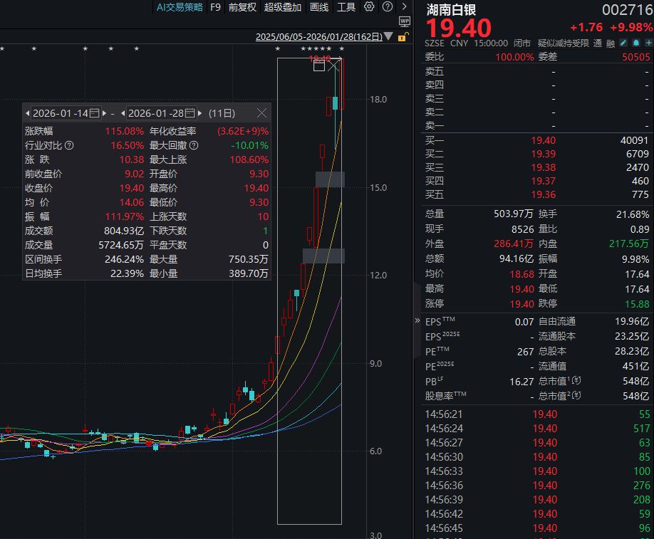 而如果将时间线稍微拉长,自2025年12月22日至今日(2026年1月28日)收盘,湖南白银在26个交易日内股价累计涨幅已达210.40%。